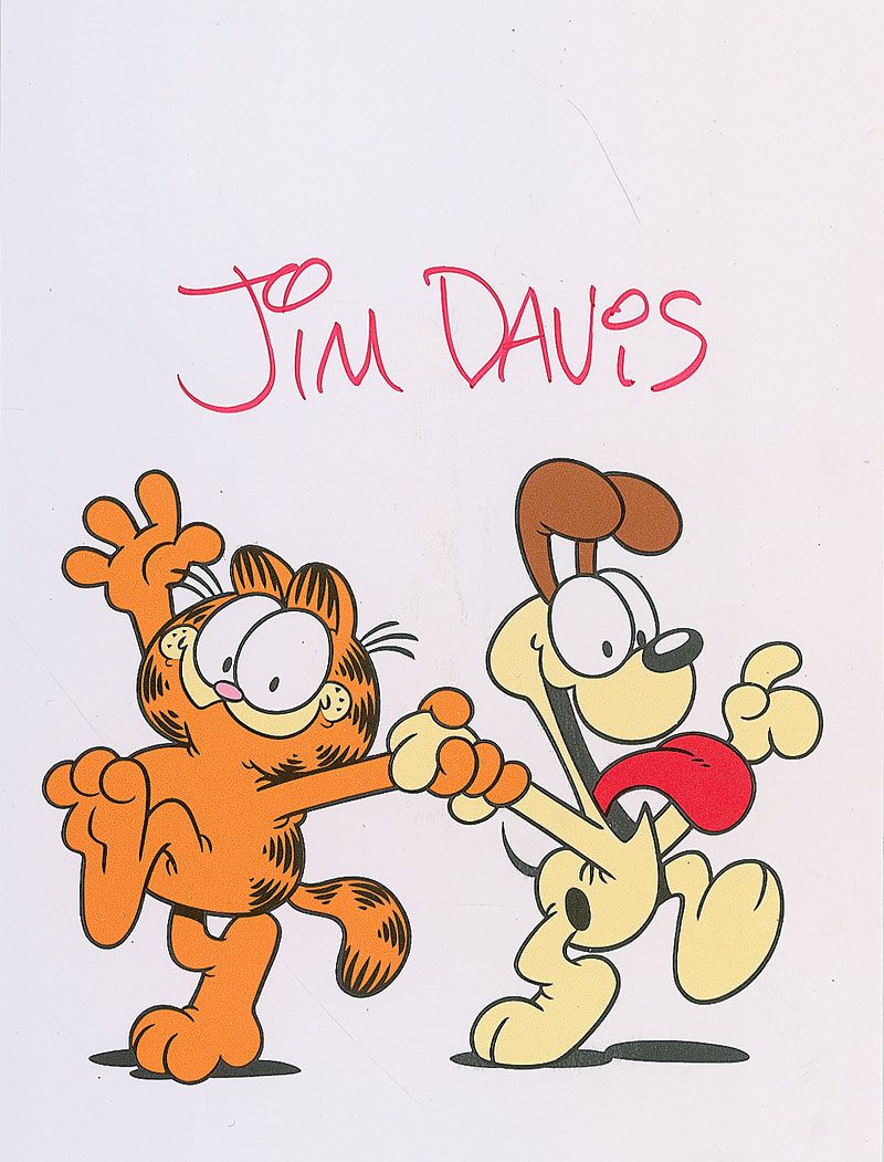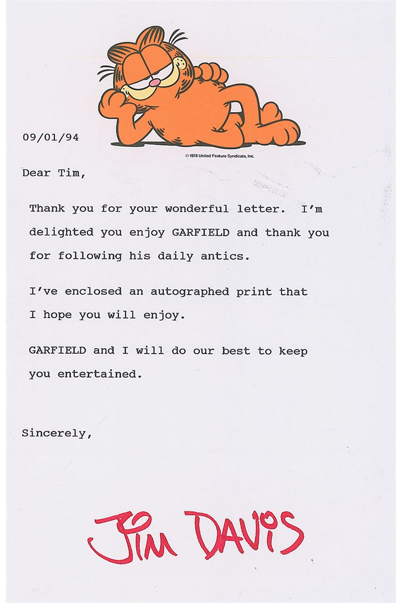 Two items: TLS, one page, 5.5 x 8.5, illustrated Garfield letterhead, thanking an admirer; and one color 4.5 x 6 cardstock photo of Garfield and Odie, signed in red felt tip. In fine condition. Accompanied by the original mailing envelope.