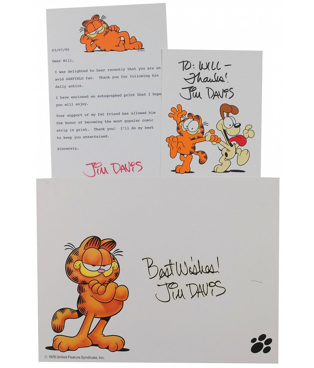 Three items: one printed color sketch of Garfield on an off-white 10 x 8 cardstock sheet, signed in black felt tip, “Best Wishes! Jim Davis”; one printed color sketch of Garfield and Odie on an off-white 4.5 x 6 cardstock sheet, signed and inscribed in black felt tip, “To: Will—Thanks! Jim Davis”; and one TLS, one page, 5.5 x 8.5, illustrated Garfield letterhead, March 7, 1995, responding to an autograph request. In overall fine condition, with haloing to the signature on the large printed sketch.