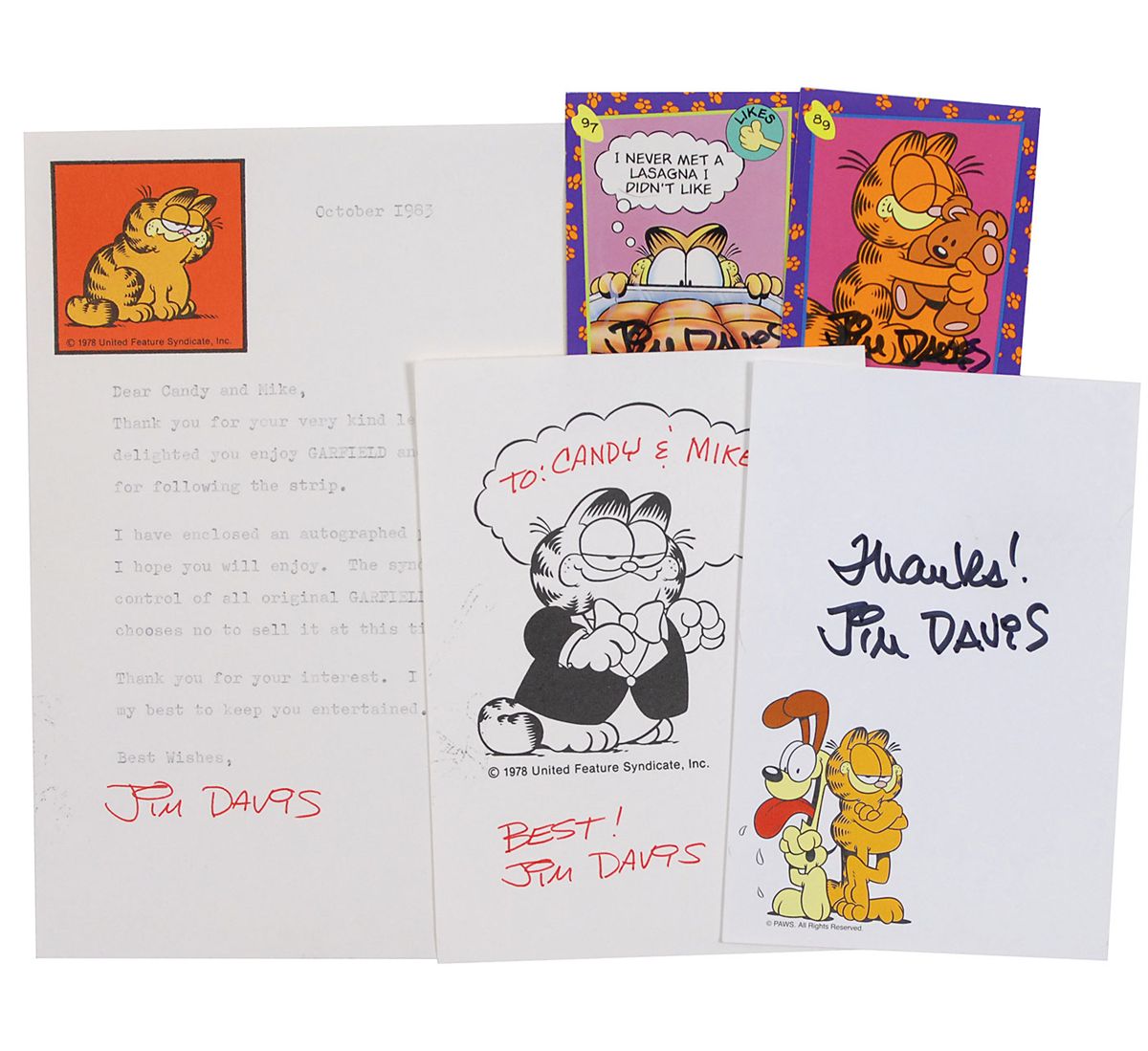 Five items: TLS, one page, 5.5 x 8.5, Garfield letterhead, October 1983, responding to an autograph request; two color 2.5 x 3.5 Garfield trading cards, both signed in black felt tip; off-white 4.5 x 6.25 card featuring an image of Garfield, signed and inscribed in red felt tip; and an off-white 4 x 6 card featuring an image of Garfield and Odie, signed in black felt tip. In overall fine condition. Accompanied by two original mailing envelopes.