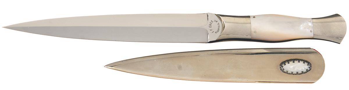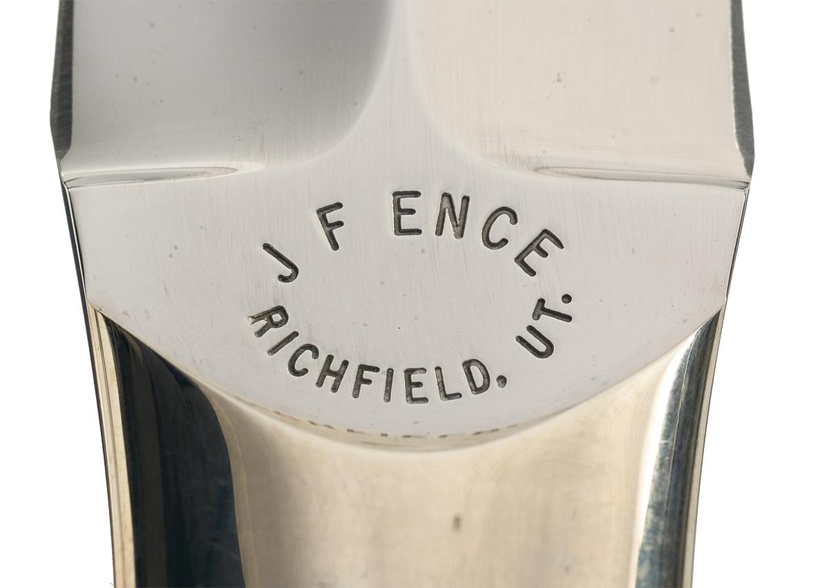 This dagger was handcrafted by Jim Ence. Jim Ence has handcrafted knives that have been compared to the craftsmanship of his long time friend and neighbor legendary knifemaker Buster Warenski. For years Ence and Warenski scouted the hills of Utah looking for minerals and gemstones and each influenced the other in his knifemaking. This Ence dagger has a 7 1/4 inch blade marked "J F ENCE / RICHFIELD UT." The handle has pearl panels secured with four rivets. The dagger is complete with a sheath adorned with an oval piece of pearl. OAL: 11 1/8".