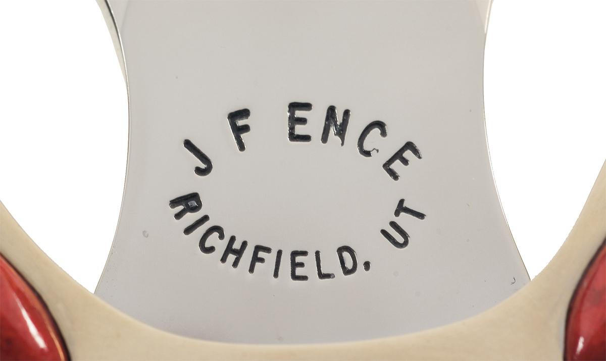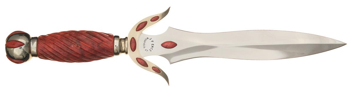 Jim Ence has handcrafted knives that have been compared to the craftsmanship of his long time friend and neighbor legendary knife maker Buster Warenski. For years Ence and Warenski scouted the hills of Utah looking for minerals and gemstones and each influenced the other in his knife making. This Ence dagger features a 7 inch blade marked "J F ENCE / RICHFIELD UT". The handle is fluted red coral, with five pieces of red coral inset on the rounded steel pommel. Inset pieces of coral also adorn the turned down steel guard and on the flat surfaces of the blade. OAL: 11 1/4"