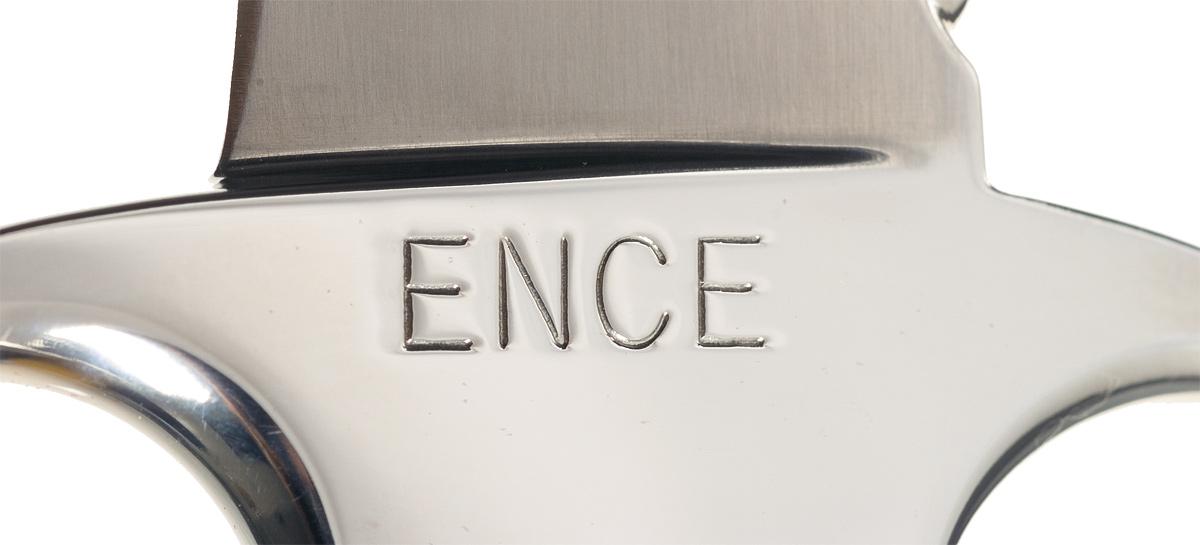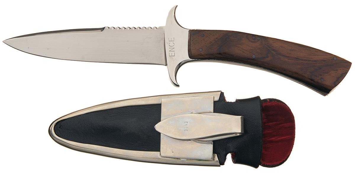This knife was fabricated by master knifemaker Jim Ence. Jim Ence has handcrafted knives that have been compared to the craftsmanship of his long time friend and neighbor legendary knifemaker Buster Warenski. For years Ence and Warenski scouted the hills of Utah looking for minerals and gemstones and each influenced the other in his knifemaking. This Ence knife features a 3 3/4 inch blade with a rope pattern on the spine. The left side of the turned down guard is marked "ENCE". Fitted with nicely figured hardwood scales secured to the tang with six rivets. OAL: 8" Complete with leather sheath with "ENCE" marked on the silver belt clip.
