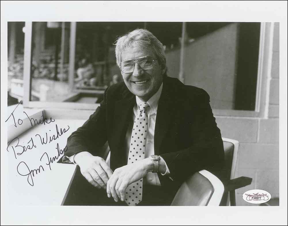 Top-flight administrator, he developed the Vikings, Bears, and Saints, all teams with losing records, into winners. Posthumously enshrined in the Hall of Fame in 1995. Glossy 10 x 8 photo, signed and inscribed in black felt tip “To Mike, Best wishes, Jim Finks.” In fine condition, with a James Spence authentication label affixed to lower corner. Accompanied by a certificate of authenticity from James Spence.
