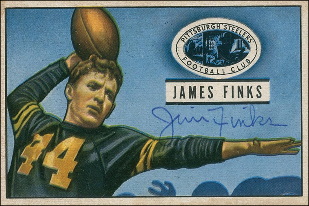 Top-flight administrator, he developed the Vikings, Bears and Saints, all teams with losing records, into winners. Posthumously enshrined in the Hall of Fame in 1995. Original 1951 Bowman football trading card, signed on the front in blue ballpoint. In fine condition.