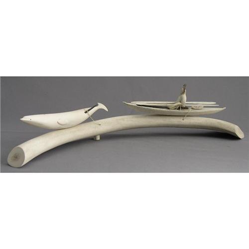 Canadian, Tuktoyaktuk [20th/21st century] HUNTER IN KAYAK WITH WHALE; 1993 carved bone with fur and sinew accents on an antler base 4 x 17.5 x 6 in. (10.2 x 44.5 x 15.2 cm) signed & dated