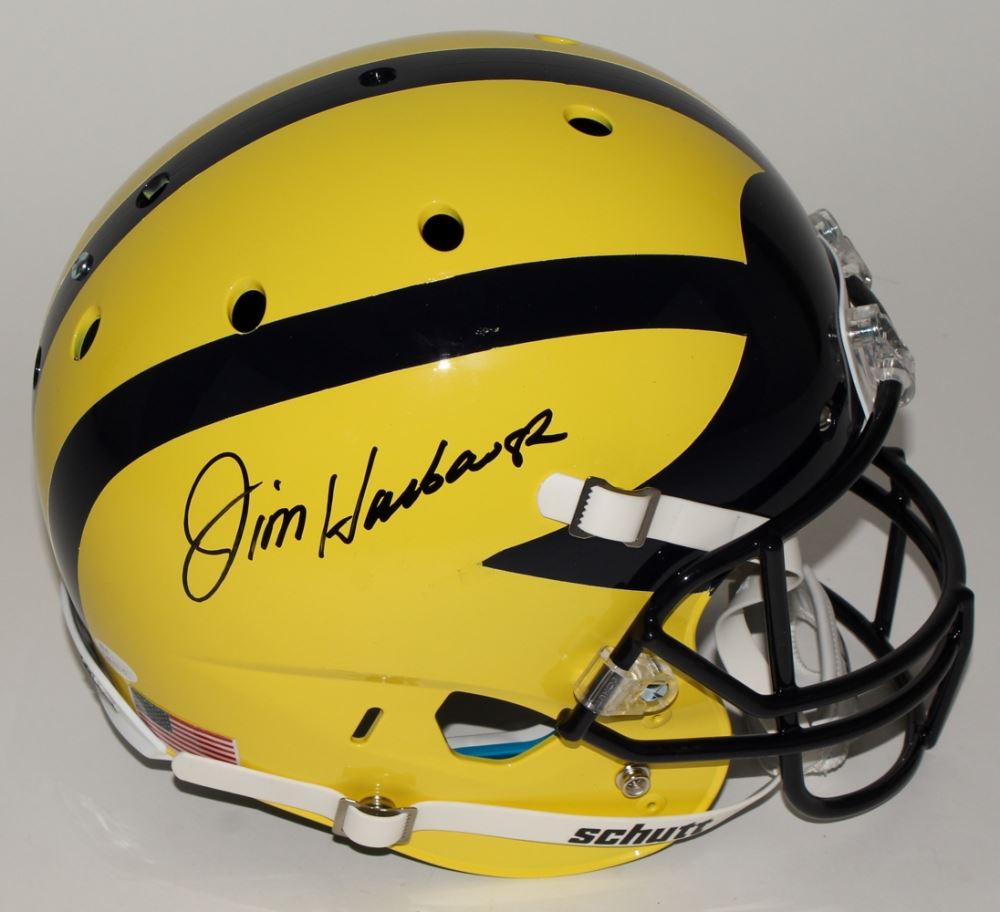 Schutt custom matte yellow full-size replica helmet has been hand-signed in black felt-tip pen by Jim Harbaugh (Bears).
