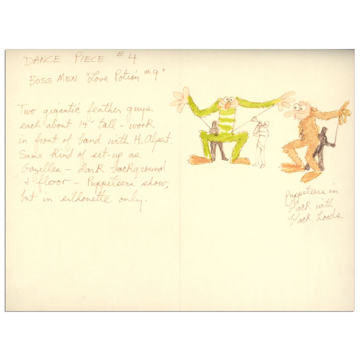 Original Jim Henson ''Muppets'' character sketch of his early characters, ''The Boss Men,'' or ''Two gigantic feather guys each about 14' tall''. The Boss Men made an early television debut along with the other Muppets on 13 October 1974 with a guest spot on a Herb Alpert television special, ''Herb Alpert & the Tijuana Brass.'' Sketch with handwritten notes by Henson portrays an envisioned scene for the show, which Henson used for a pitch meeting with ATV Studios in London. The Muppet Show filmed two pilots, one in 1974 and one in 1975 before being aired in 1976. Story-board type sheet has detailed handwritten notes by Henson envisioning a Boss Men dance number: ''Dance Piece #4 Boss Men 'Love Potion #9' / Two gigantic feather guys each about 14' tall - work in front of band with H. Alpert. Same kind of set-up as Gazelles - dark background & floor - Puppeteers show, but in silhouette only. Puppeteer in black with black hood''. With two detailed color pencil sketches of the Boss Men with their respective muppeteers guiding them. The Bossmen did indeed dance around Alpert while the band performed. At the end of the number, Jim Henson and Frank Oz are seen sitting in the audience, performing Bert and Ernie. White board measures 13.75'' x 10.75'' and is framed in a transparent acrylic case equipped with wall mountings to an overall size of 17.25'' x 14.25''. A few minor scratches to acrylic, else near fine condition.