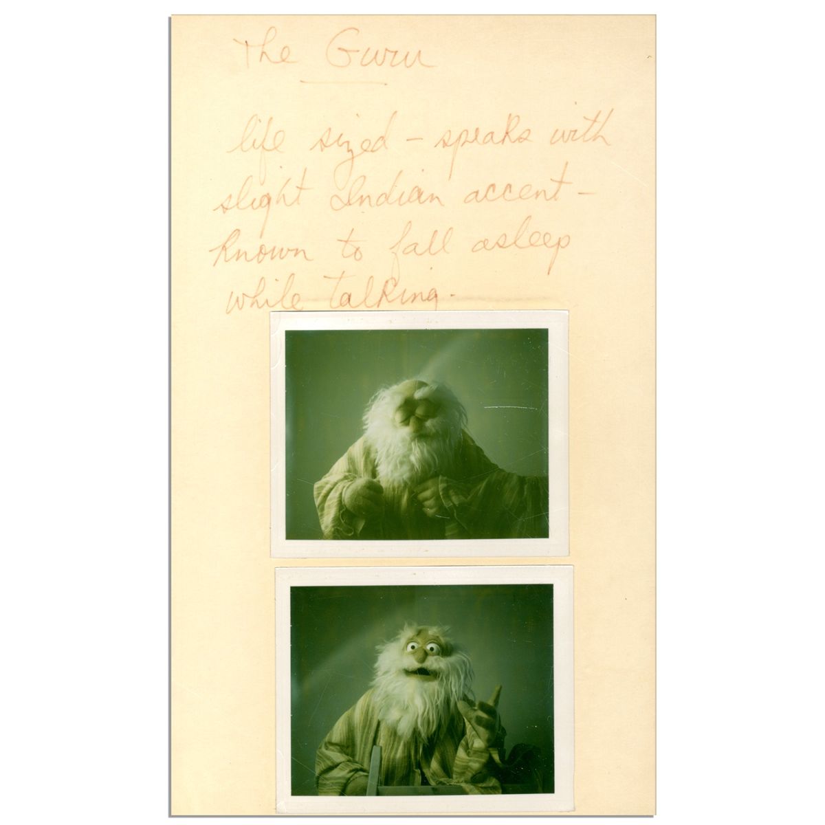 Early Muppet characterization in Jim Henson's hand. Characterization presents original Muppet character Brewster, here called simply, ''The Guru''. Henson handwrites: ''THE GURU / life sized - speaks with slight Indian accent - known to fall asleep while talking.'' Beneath, the puppeteer affixes two Polaroids of the bearded narcoleptic. The Guru made an appearance along with other early Muppets on 13 October 1974 in a guest spot on a Herb Alpert television special, which help launched The Muppets into animation superstardom. Single-page characterization measures 6.75'' x 10.5''. Framed inside a transparent acrylic case equipped for wall mounting to an overall size of 10.5'' x 14.5''. Toning to paper and fading to ink and photos, else near fine. With provenance from Bonham's.