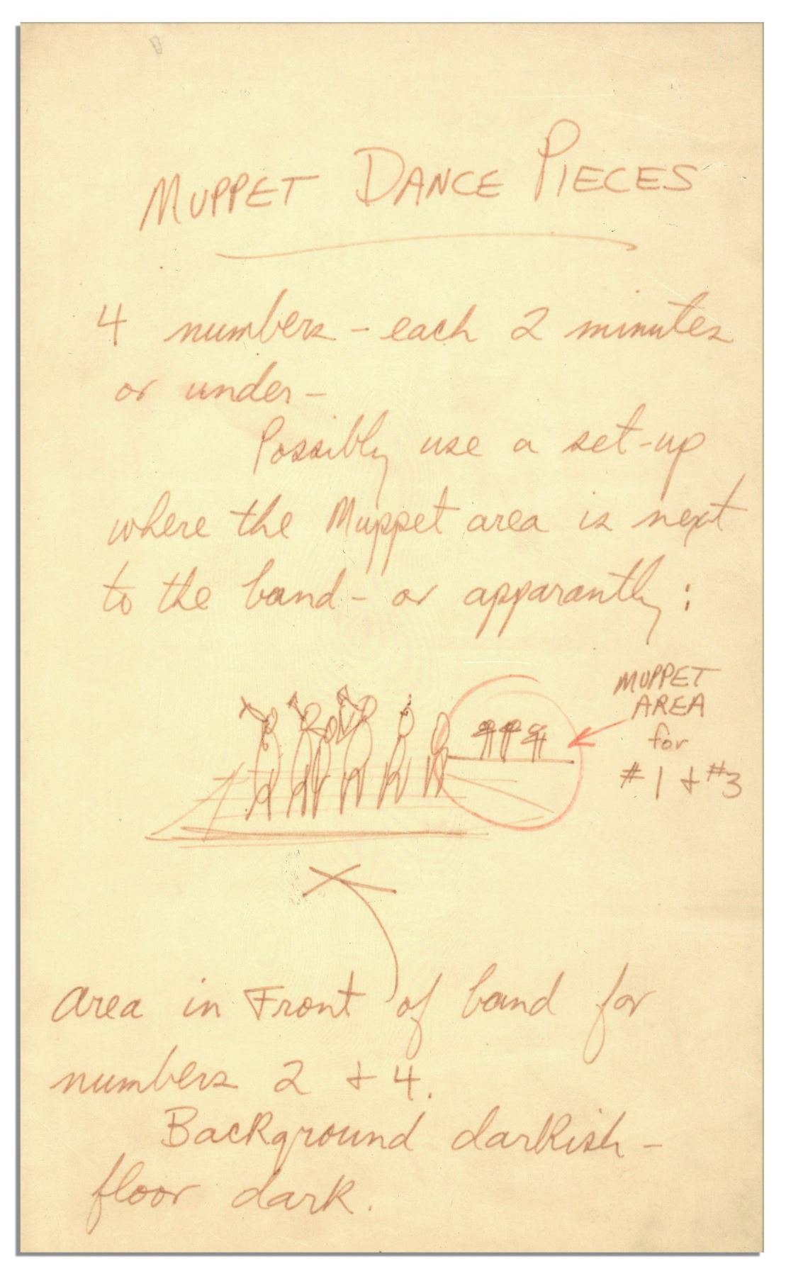 Early ''Muppets'' sketch and handwritten notes by the show's legendary creator, Jim Henson, used in a pitch meeting by Henson to promote the Muppets. The Muppets made one of their early debuts on 13 October 1974 with a guest spot on a Herb Alpert television special. Sketch with handwritten notes by Henson portrays a scene for the variety show, ''Herb Alpert & the Tijuana Brass'' which became the very first on-air debut of a few of the Muppets characters. Henson pitched to ATV Studios in London, sending them this board in anticipation of a 1974 pitch meeting. ''The Muppet Show'' filmed two pilots, one in 1974 and one in 1975 before being aired in 1976. Story-board type sheet has detailed handwritten notes in now-faded ink by Henson envisioning the Muppets performances with the Herb Alpert band: ''Muppet Dance Pieces / 4 numbers - each 2 minutes of under - Possibly use a set-up where the Muppet area is next to the band - or apparently: area in front of the band for numbers 2 & 4. Background darkish - floor dark''. With a color pencil sketch of six band members and three Muppets, with two proposed positions by Henson of where the Muppets should go. White board measures 6.75'' x 10.5'' and is framed in a transparent acrylic case equipped with wall mountings to an overall size of 10.25'' x 14.5''. A couple minor scratches to case, toning to board and faded ink, else near fine condition overall.