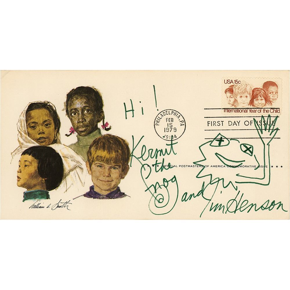 FDC, 7.5 x 3.75, with a color cachet honoring the 'International Year of the Child,' with matching 15-cent stamp, postmarked in Philadelphia on February 15, 1979, signed in green felt tip, "Hi! Kermit the frog and Jim Henson," who adds a delightful sketch of his iconic amphibian Muppet. In very fine condition.