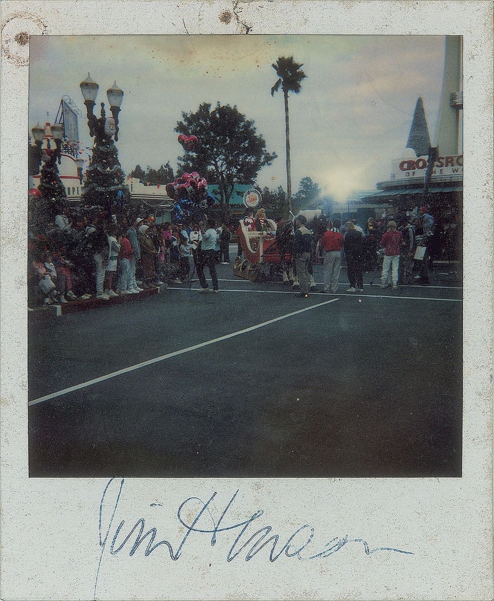 Uncommon pair of color glossy 3.5 x 4.25 Polaroids taken during filming of an apparent Muppets Christmas special. One photo features Jim Henson sitting behind a movie camera, propping Kermit the Frog with his right hand, and the second, signed in the lower border in blue ballpoint by Henson, shows a horse-drawn sleigh idling on a street, Christmas trees to the left and a palm tree rising in the background. In very good condition, with wrinkling and pin holes to borders.