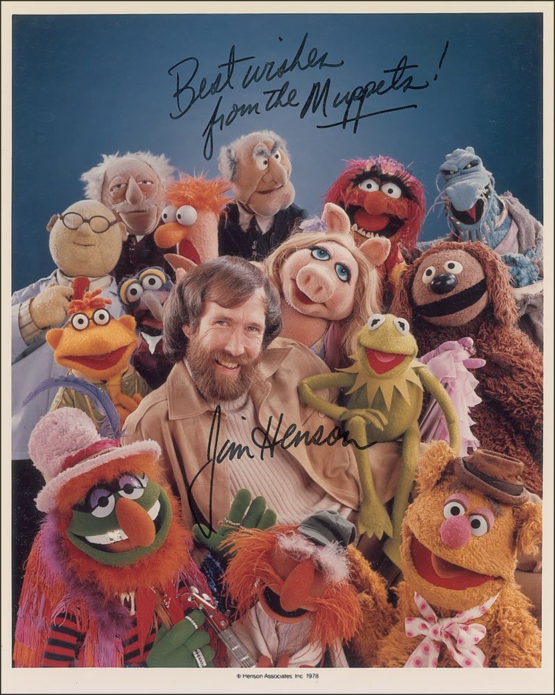Color satin-finish 8 x 10 photo of Henson surrounded by a gaggle of Muppets, signed in black felt tip, “Best wishes from the Muppets! Jim Henson.” In fine condition, with a few light bends and a thin line of slight discoloration passing through end of sentiment.