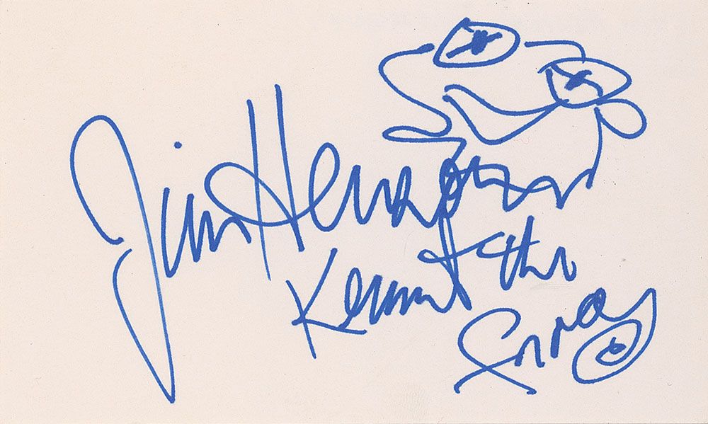 Original felt tip sketch of Kermit the Frog on an off-white 5 x 3 card, whimsically signed, “Jim Henson, Kermit the Frog.” In very fine condition.