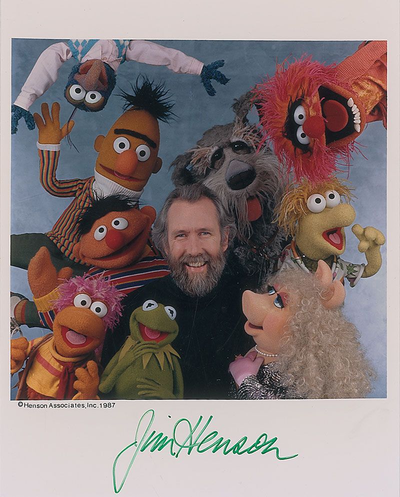 Color glossy 8 x 10 photo of Henson surrounded by a gaggle of his Muppet creations, signed in the lower border in green felt tip. In very fine condition.
