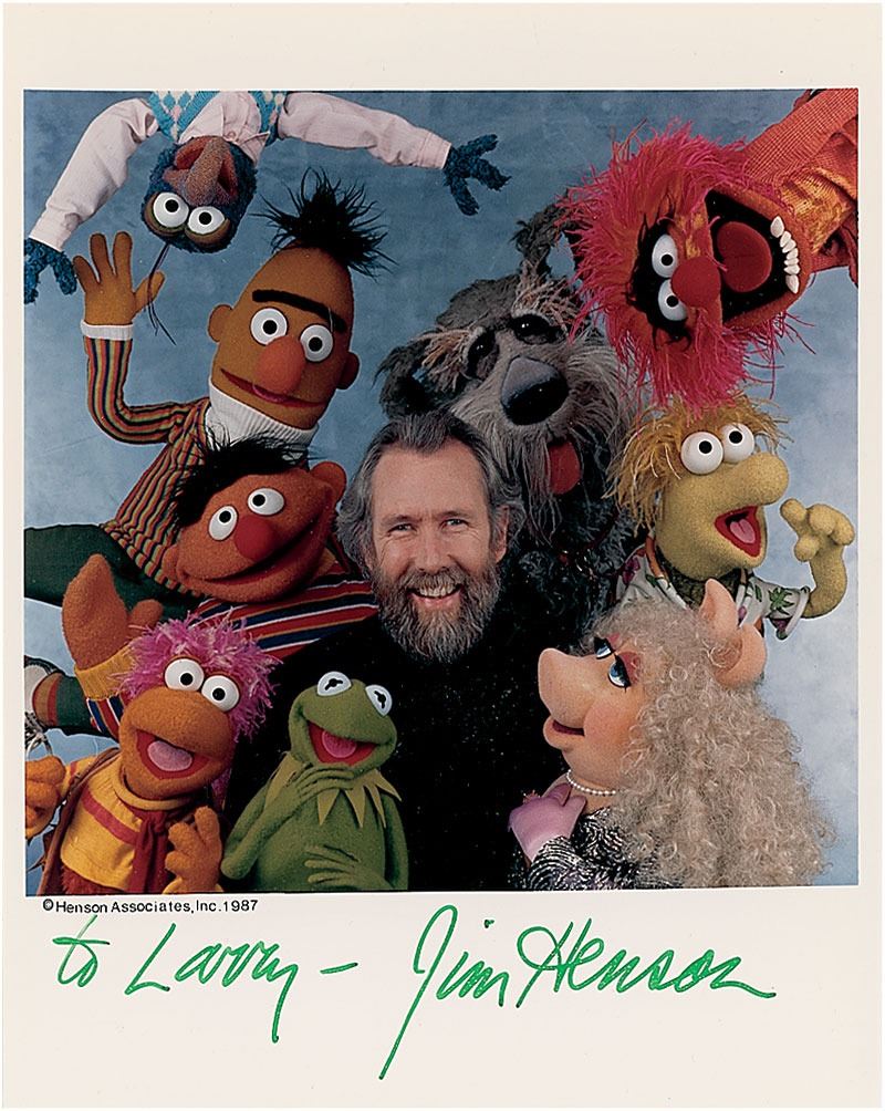 Excellent color glossy 8 x 10 photo of Henson surrounded by Kermit, Ernie, Bert, Miss Piggy, and five other classic Muppets, signed and inscribed in the lower border in green felt tip, “To Larry—Jim Henson.” In fine condition, with trivial irregular ink adhesion to the signature.