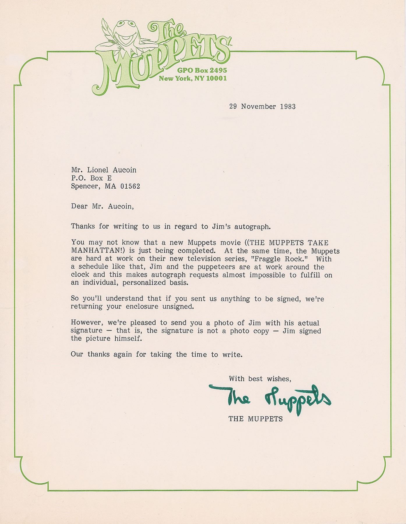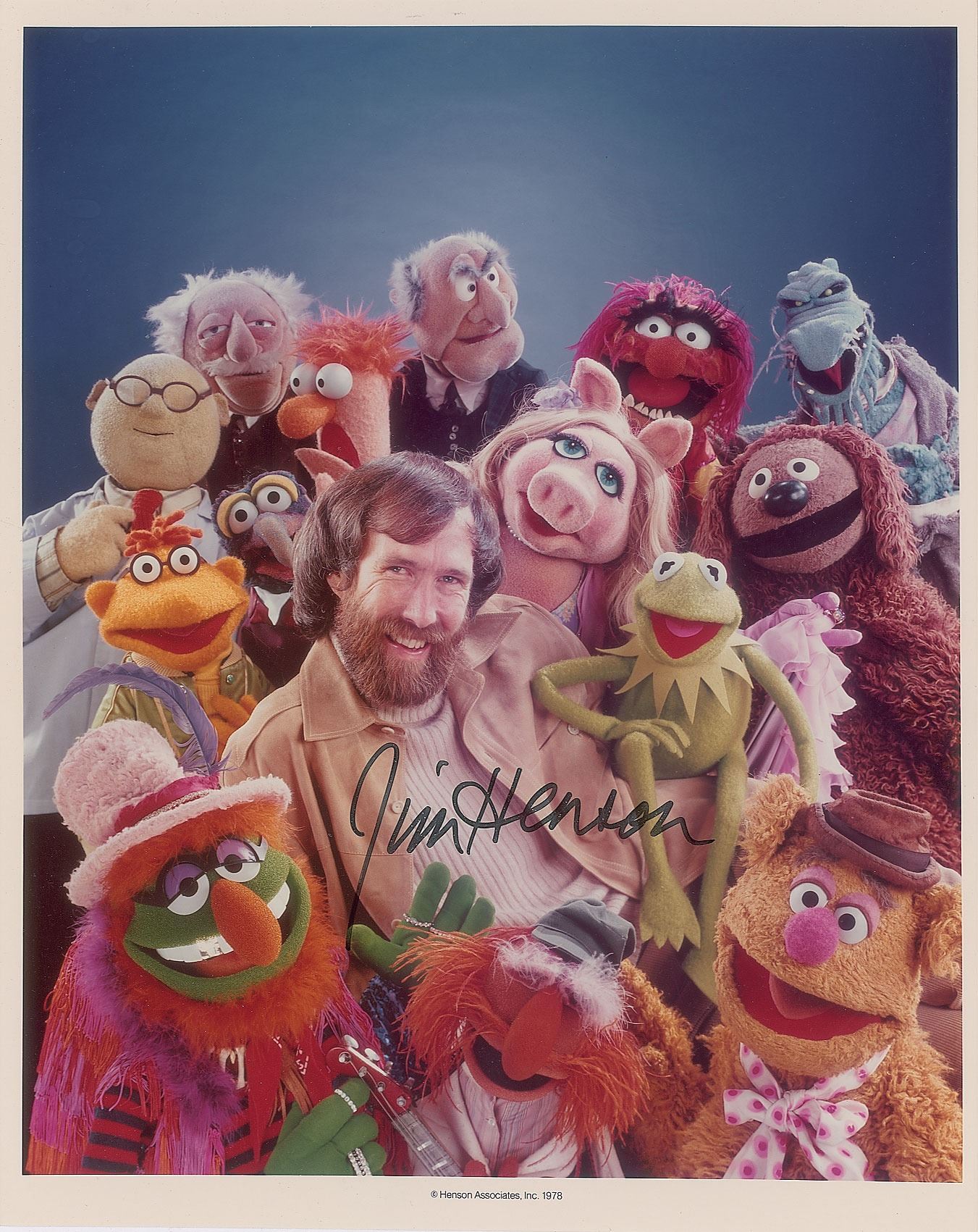 Classic color satin-finish 8 x 10 photo of Henson surrounded by his Muppet puppets, signed in black felt tip. In fine condition. Accompanied by a 1983 transmittal letter from The Muppets.