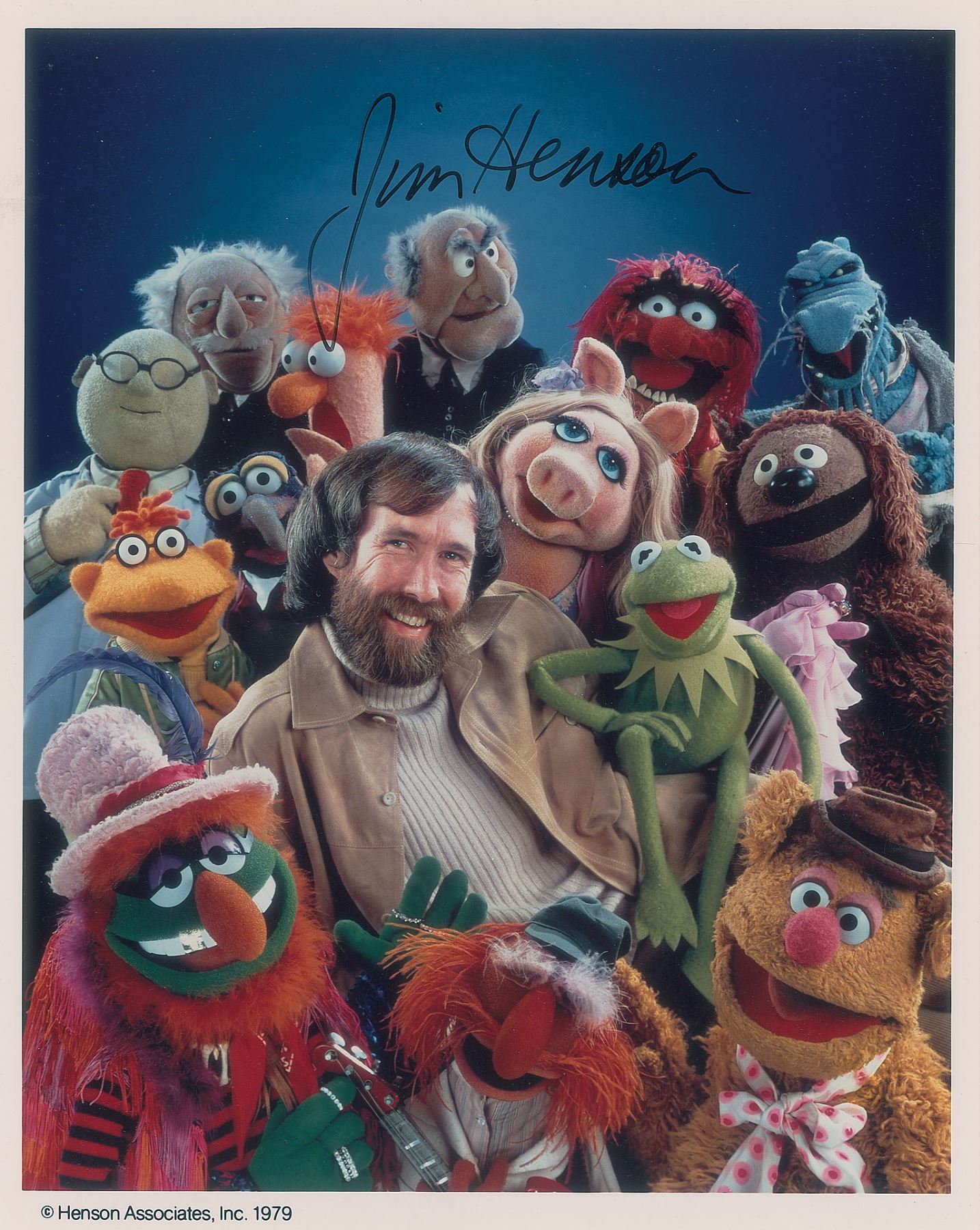 Classic color satin-finish 8 x 10 photo of Jim Henson surrounded by his Muppet friends, signed in black felt tip. In fine condition.