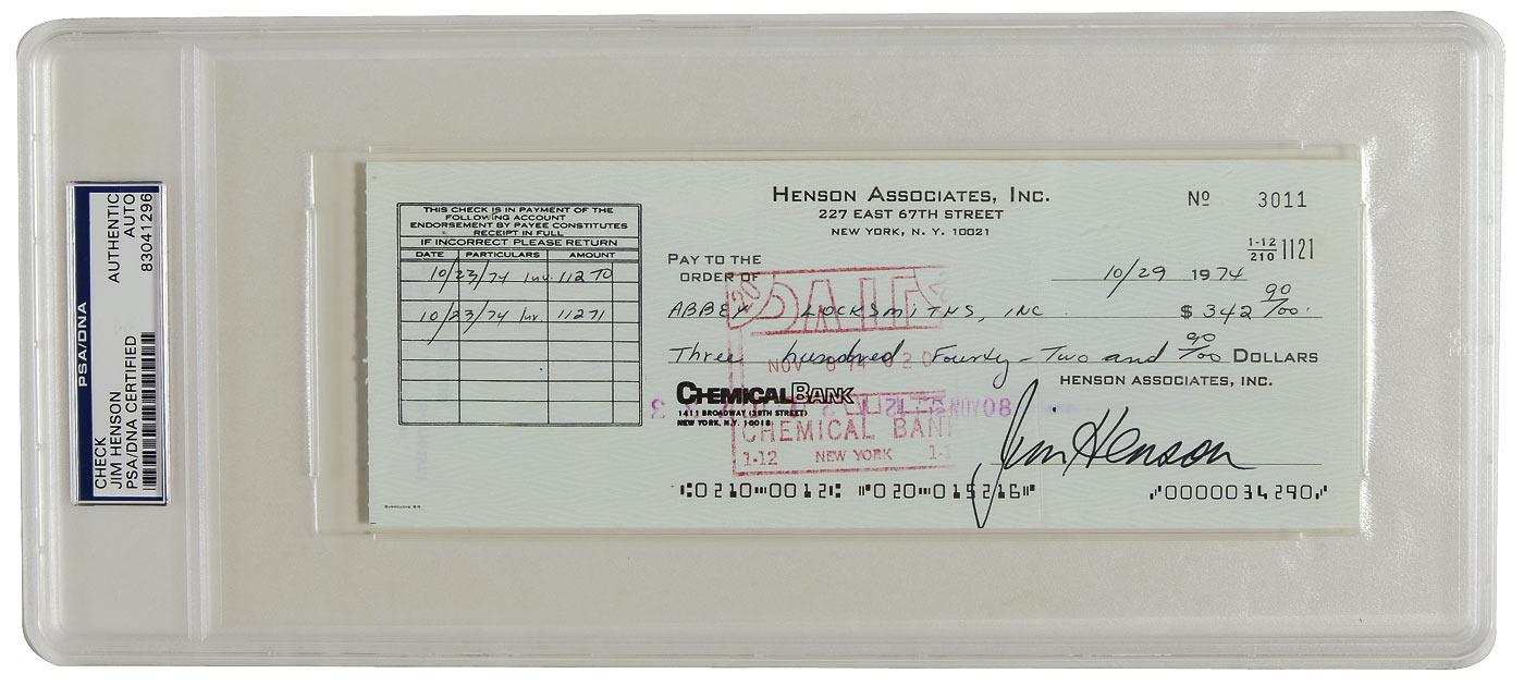 Business check, 8.25 x 3, filled out in another hand and signed by Henson, payable to Abbey Locksmiths, Inc. for $342.90, October 29, 1974. Encapsulated in a plastic PSA/DNA authentication holder. In fine condition, with expected cancellation stamps, and an unobtrusive vertical fold passing through the signature. RRAuction COA.