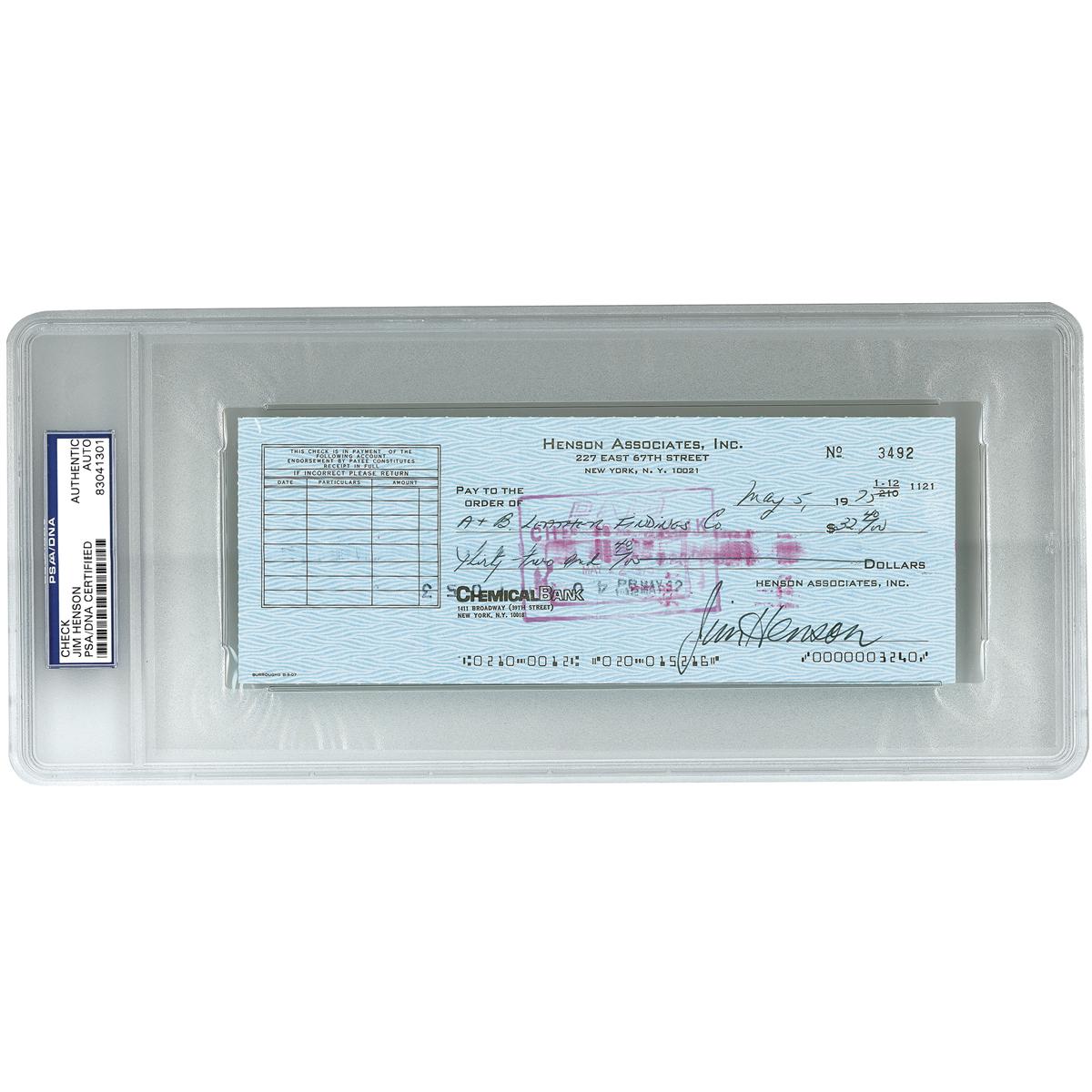 Business check, 8.25 x 3, filled out in another hand and signed by Henson, payable to A & B Leather Findings Co. for $32.40, May 5, 1975. Encapsulated in a plastic PSA/DNA authentication holder. In fine condition, with expected cancellation stamps just touching the top of the signature.