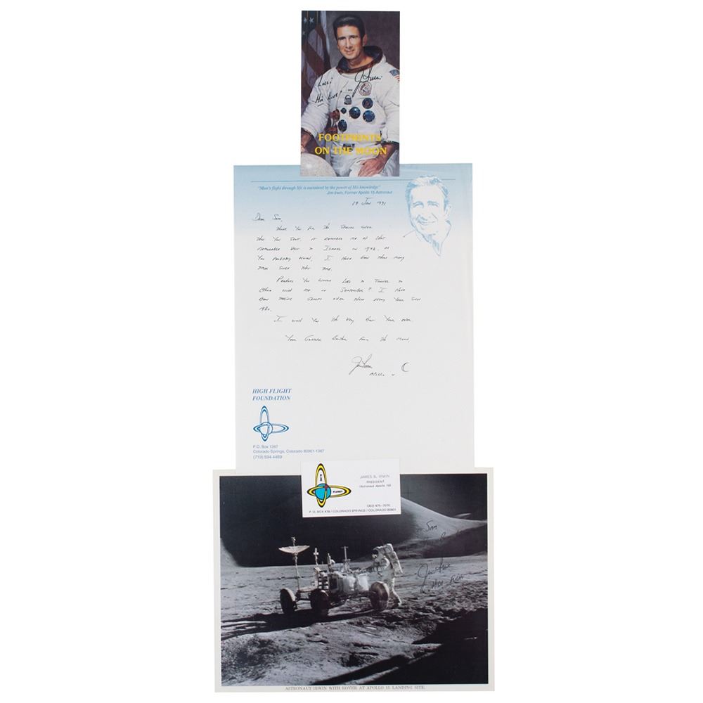 Four items signed by Jim Irwin, including: an ALS, one page, High Flight Foundation letterhead, January 19, 1991, in part: "Thank you for the special cover that you sent. It reminded me of that memorable visit to Israel in 1972. As you probably know, I have been there many times since that time. Perhaps you would like to travel to China with me in September? I have been taking groups over there every year since 1980"; an official color 10 x 8 NASA lithograph of Irwin with the LRV on the lunar surface, signed and inscribed in black felt tip, "To Sam, Very Best Wishes, Jim Irwin, High Flight"; a small 'Footprints on the Moon' pamphlet, signed in black felt tip, "Lolli, His Love, Jim Irwin"; and a felt tip signature, "Jim Irwin," on the reverse of his High Flight business card. In overall very good to fine condition, with some creasing and surface loss to the top of the letter.