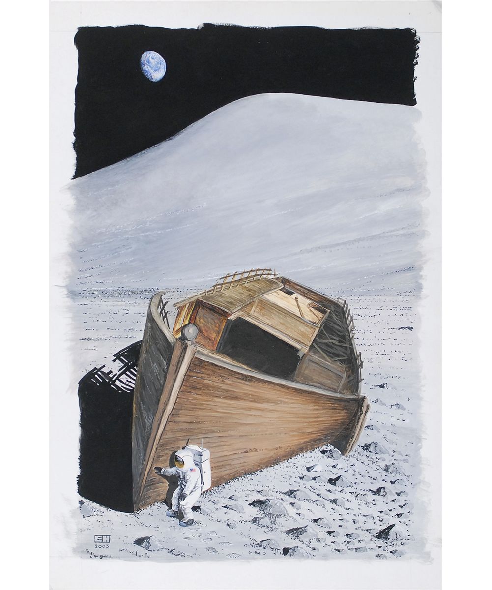 Detailed original watercolor painting by Ed Hengeveld entitled ‘Noah’s Ark,’ 11.75 x 17.75, showing Jim Irwin finding Noah’s Ark on the lunar surface. Painting is signed in the lower left, “EH 2005.” In fine condition. Accompanied by a letter signed by Hengeveld describing the work, in part: “After returning from the Moon in 1971, Apollo-15 astronaut Jim Irwin spent the final years of his life searching for the remains of Noah’s Ark…painting this scene wasn’t easy. Apart from problems in deciding the right perspective, I didn’t have a clue how the Ark should look, or how big it should be in relation to Irwin. But after some research I think I managed to paint a reasonably convincing Ark.”