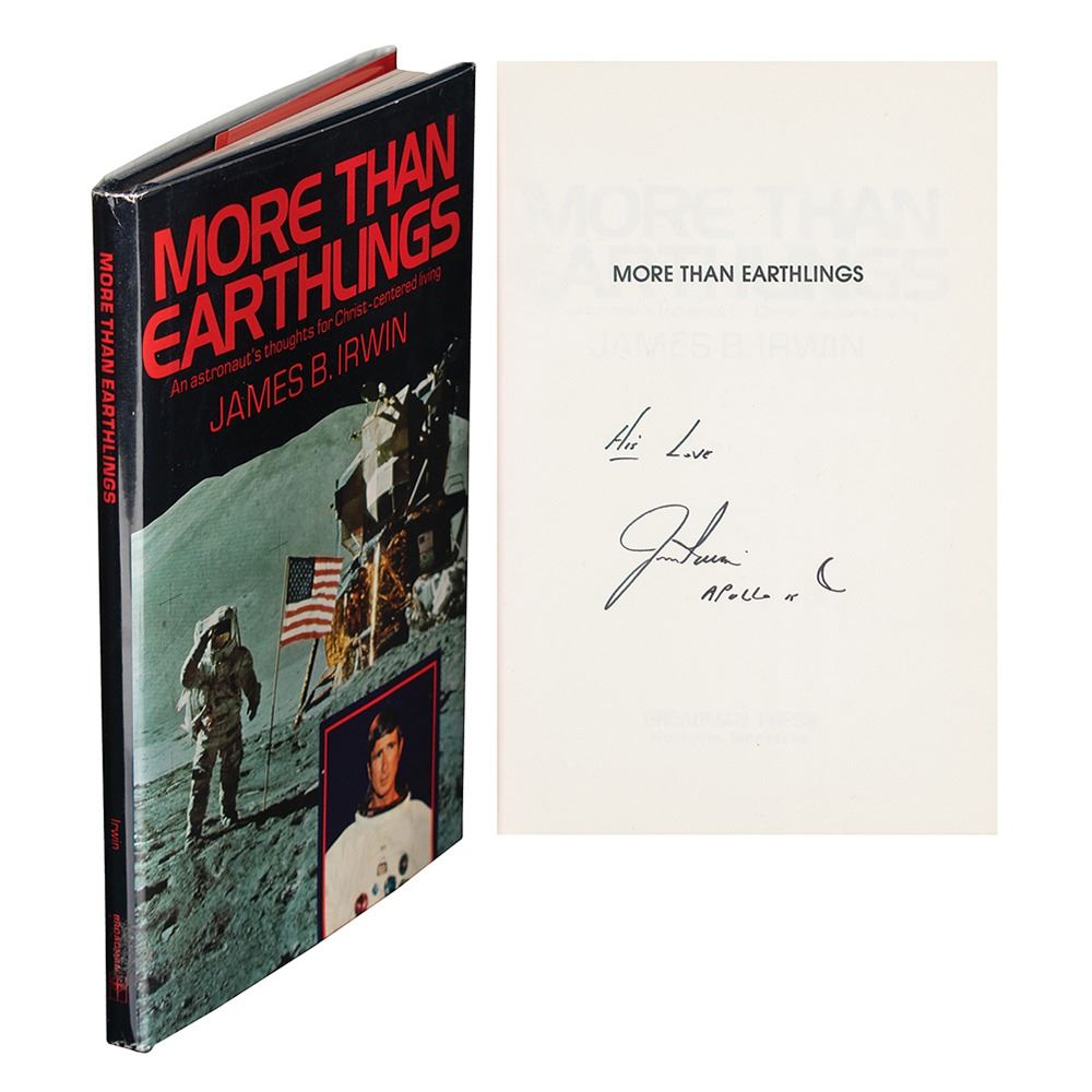 Signed book: More than Earthlings. First edition, first printing. Nashville, TN: Broadman Press, 1983. Hardcover with dust jacket, 5.75 x 8.25, 95 pages. Signed on the half-title page in black felt tip, "His Love, Jim Irwin, Apollo 15," with Irwin adding a small sketch of a crescent moon. In fine condition.
