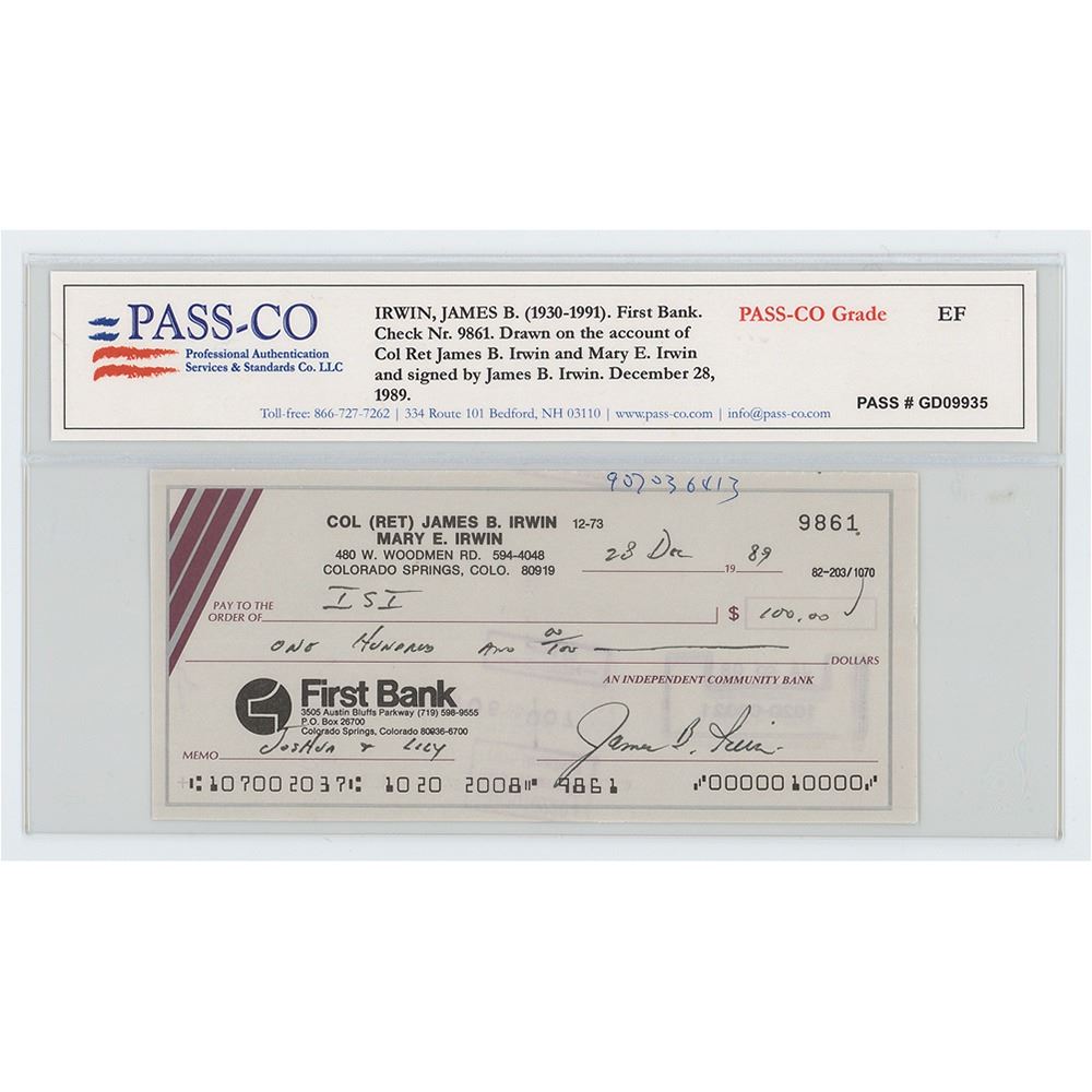 Personal check, 6 x 2.75, filled out and signed by Jim Irwin, "James B. Irwin," payable to ISI for $100, December 28, 1989. In fine condition. Encapsulated by PASS-CO.