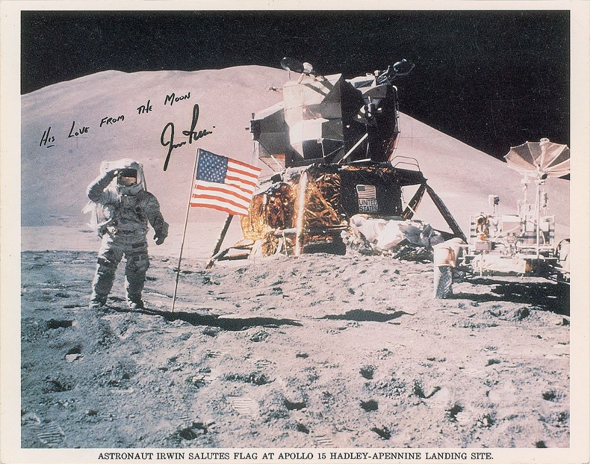 Official color 10 x 8 NASA lithograph of Irwin saluting the American flag on the lunar surface, signed in black felt tip, “Jim Irwin,” with a printed sentiment above the signature. In fine condition, with a trimmed top edge. Pre-certified Zarelli Space Authentication.