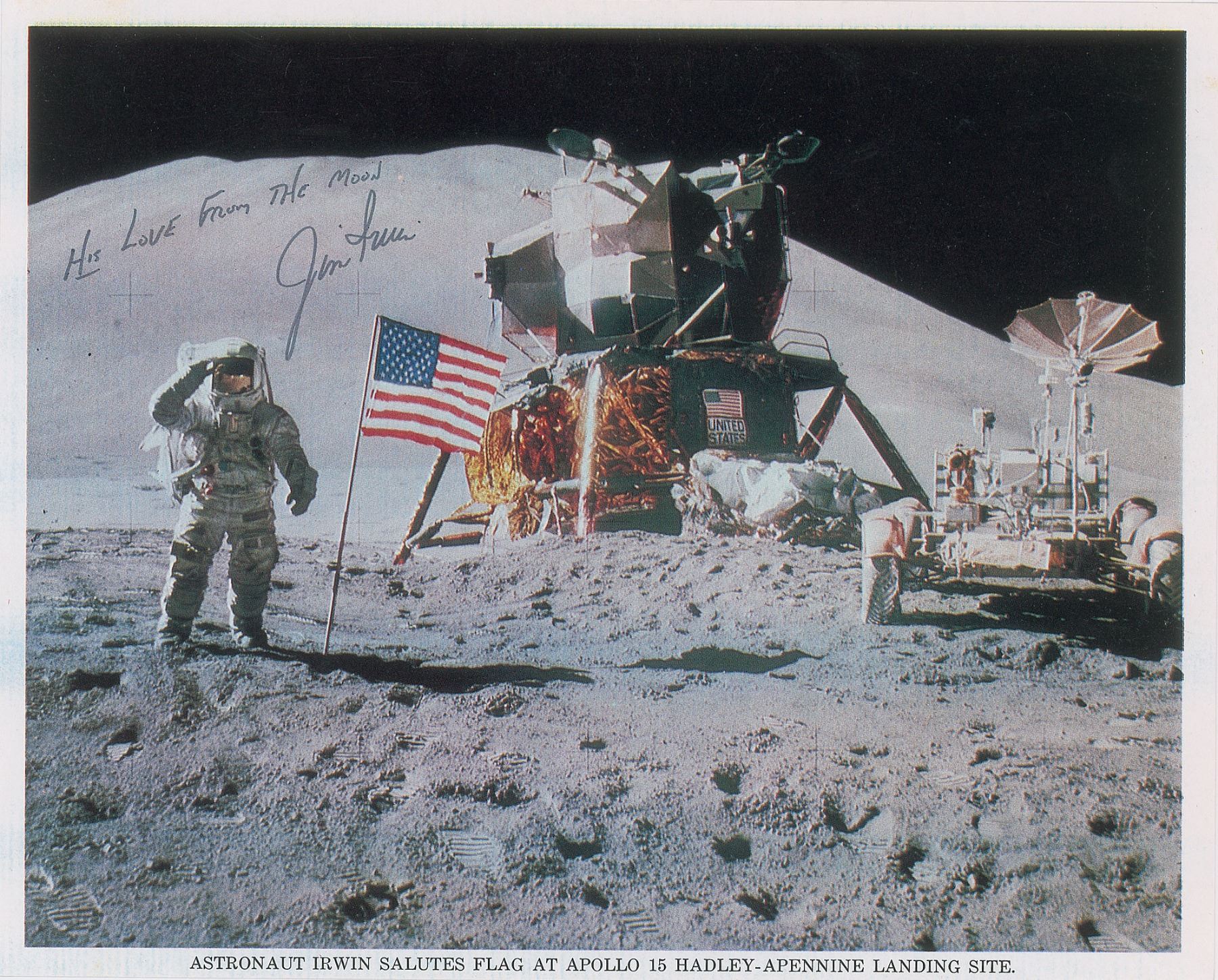 Rare official color 10 x 8 NASA lithograph of Irwin saluting the American flag on the lunar surface, signed in black felt tip, "His Love From the Moon, Jim Irwin." This scarce example is fully handwritten by Irwin, including the "His Love" inscription—typically, the message is pre-printed. In very fine condition.
