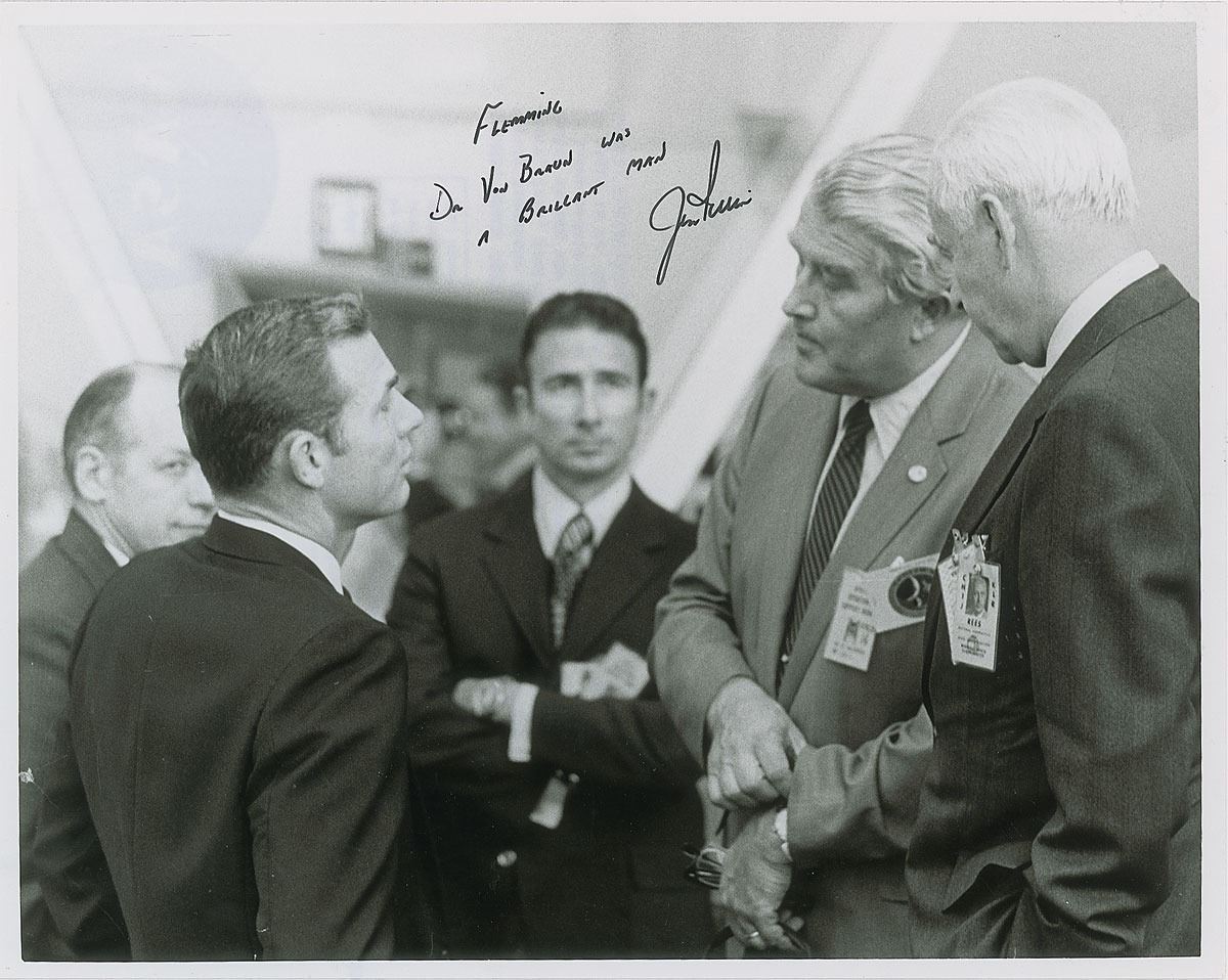 Official glossy 10 x 8 NASA photo of Jim Irwin looking on as fellow Apollo 15 moonwalker Dave Scott talks with Wernher von Braun, signed and inscribed in thin black felt tip, "Flemming, Dr. Von Braun was a brilliant man, Jim Irwin.” Reverse bears purple NASA caption text. In fine condition.
