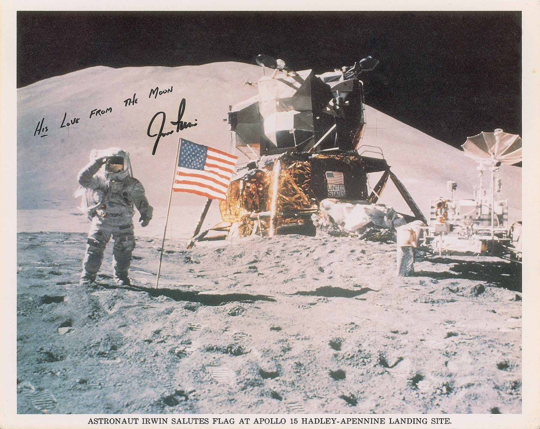 Official color 10 x 8 NASA lithograph of Irwin saluting the American flag on the lunar surface, signed in black felt tip, "Jim Irwin," with a preprinted "His Love from the Moon" sentiment above. In fine condition.