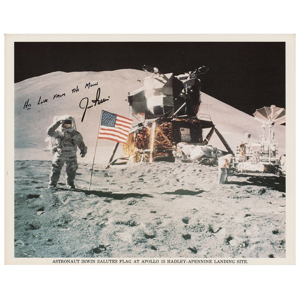 Color 10 x 8 lithograph of Irwin saluting the American flag on the lunar surface, signed in black felt tip, "Jim Irwin," with a preprinted "His Love from the Moon" sentiment above. In very fine condition.