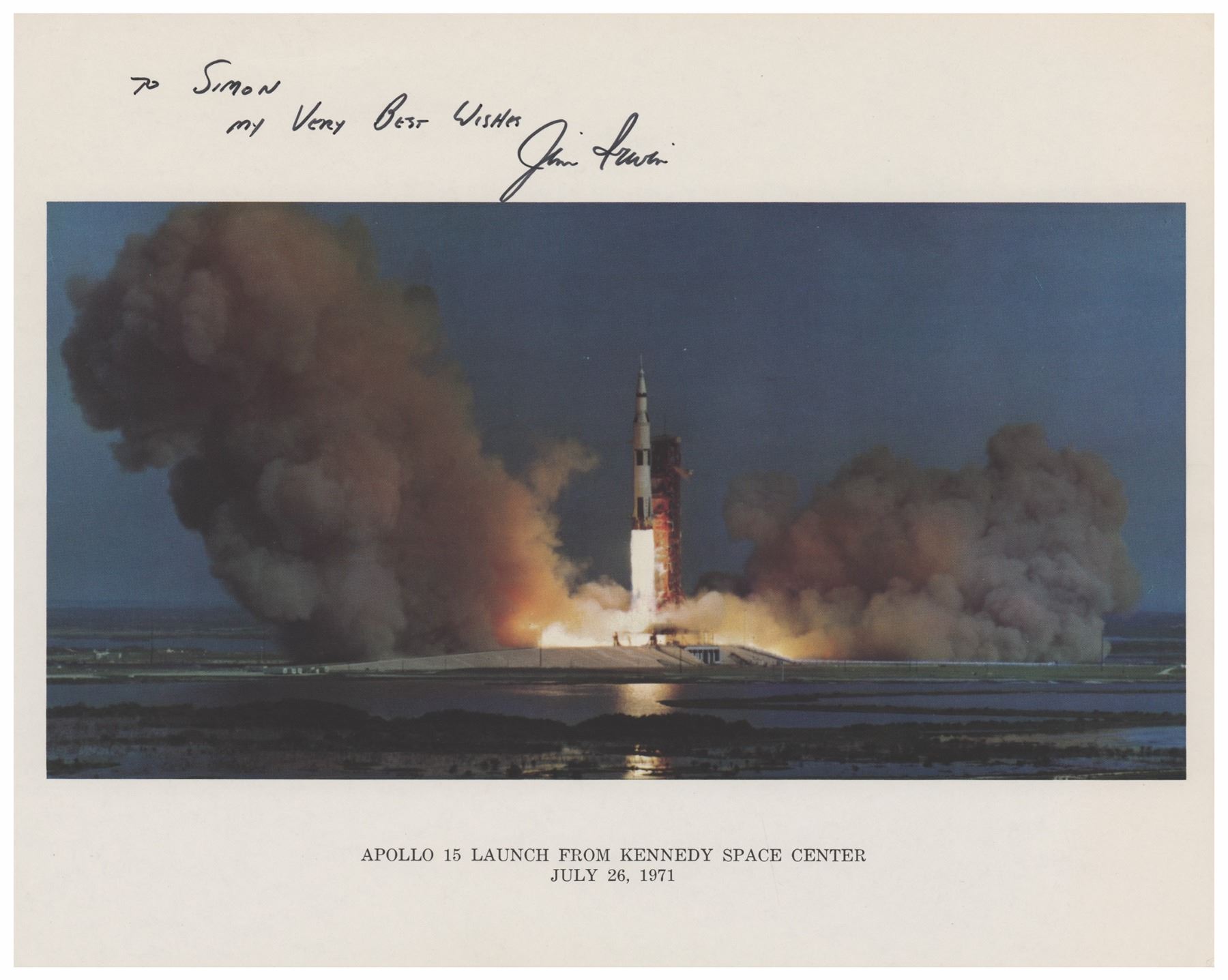 Official color 10 x 8 NASA lithograph of the Apollo 15 launch from Kennedy Space Center, signed and inscribed in the upper border in black felt tip, "To Simon, My Very Best Wishes, Jim Irwin.†In fine condition, minor dings to corner tips