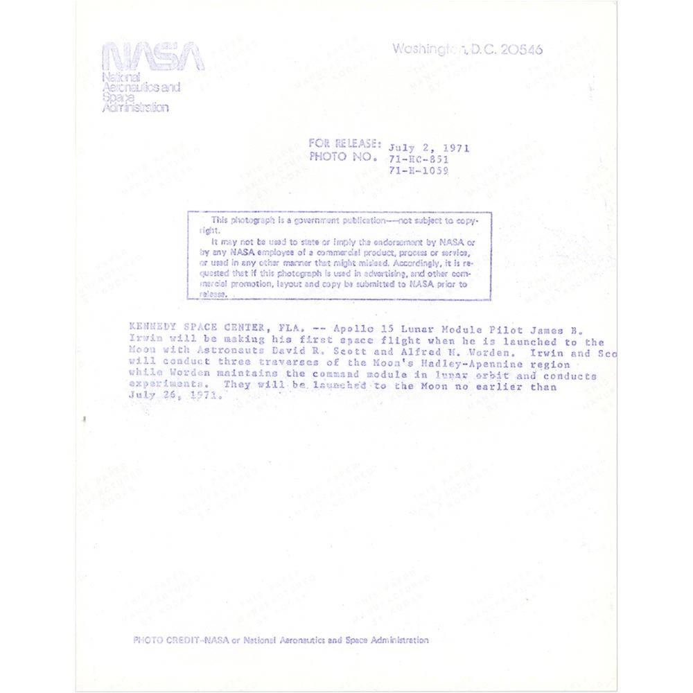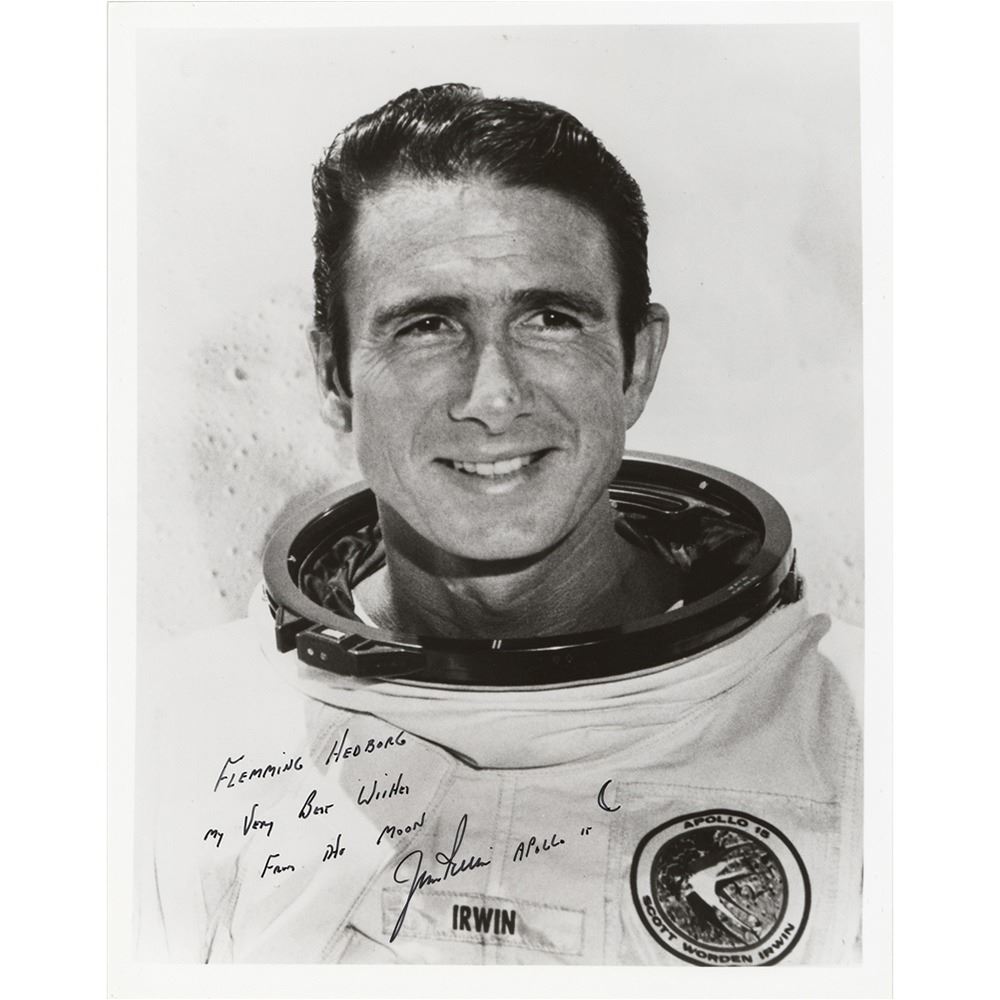Official glossy 8 x 10.25 NASA photo of the LMP for the Apollo 15 mission wearing his white space suit, signed and inscribed in black felt tip, "Flemming Hedborg, my very best wishes from the moon, Jim Irwin, Apollo 15," who adds a small crescent moon. Reverse bears purple NASA caption text and "This Paper Manufactured by Kodak" watermarks. In fine condition.