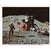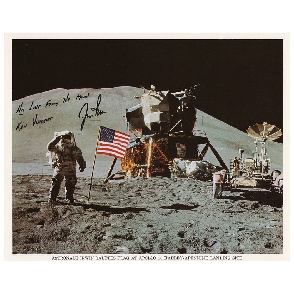 Color 10 x 8 lithograph of Irwin saluting the American flag on the lunar surface, signed and inscribed in black felt tip, "Ken Vincent, Jim Irwin," with a preprinted "His Love from the Moon" sentiment above. In fine condition, with scattered small surface creases.