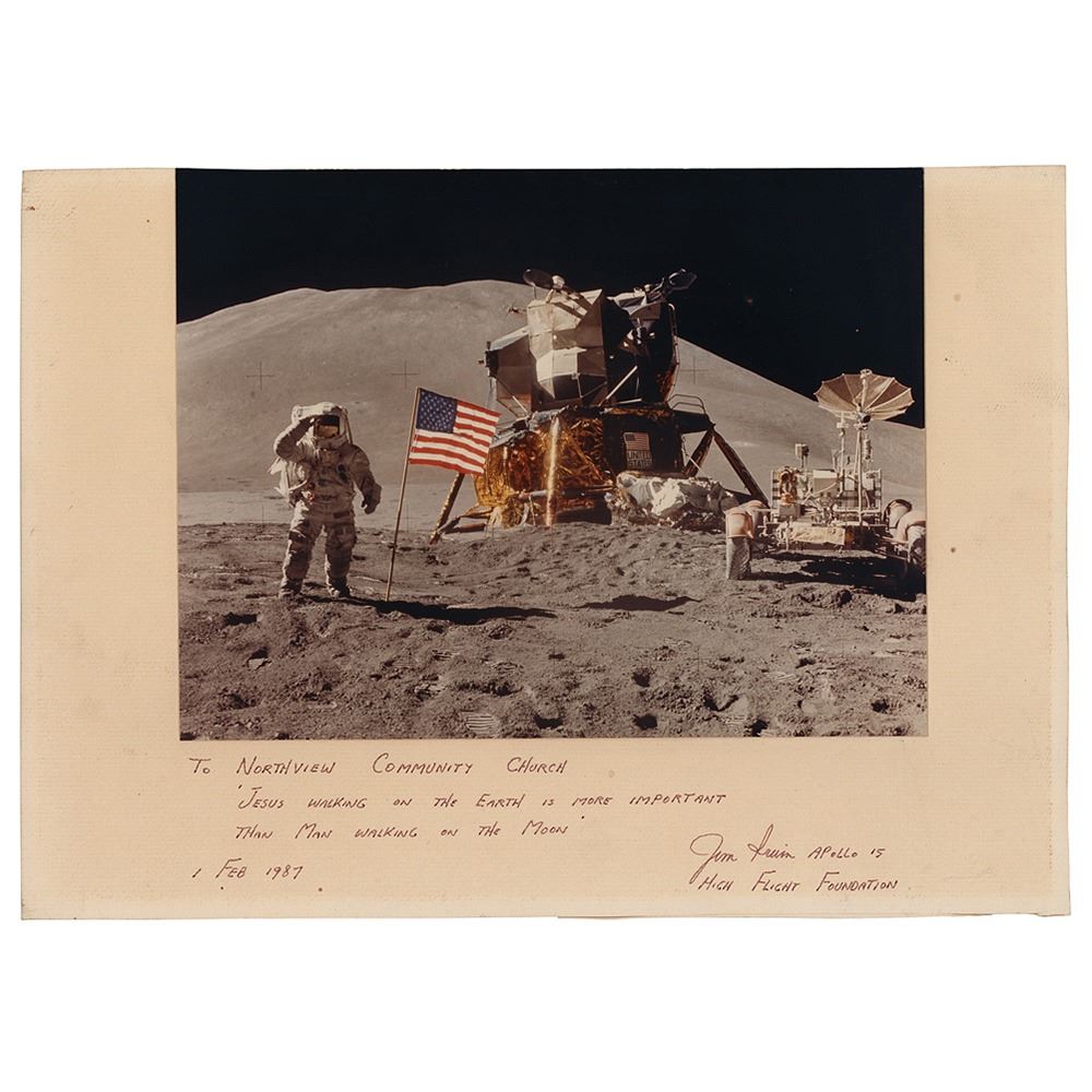 Color satin-finish 10 x 7.5 photo of LMP Irwin saluting the American flag on the lunar surface, affixed to its original 14 x 10 mount, signed and inscribed on the mount in black felt tip, "To Northview Community Church, 'Jesus walking the Earth is more important than Man walking on the Moon,' 1 Feb. 1987, Jim Irwin, Apollo 15, High Flight Foundation." Also includes a laminated souvenir card, 8.5 x 5.5, with the same religious quote written in pencil (in a collector's hand) using the flown pencil (SEB12100081-301, S/N 1019) and lead graphite carried on the Apollo 15 mission. In very good to fine condition, with some small surface impressions to the photo, and light toning and trimmed edges to the mount.