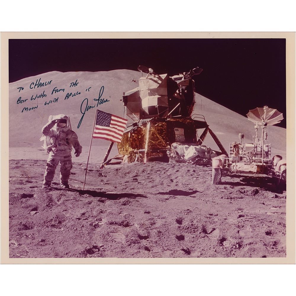 Official color glossy 10 x 8 NASA photo of Jim Irwin saluting the American flag at the Apollo 15 landing site, signed and inscribed in black felt tip, "To Charlie, Best wishes from the moon with Apollo 15, Jim Irwin.†Reverse bears purple NASA caption text and "This Paper Manufactured by Kodak" watermarks. In fine condition, with three light binder-related creases along the top edge.