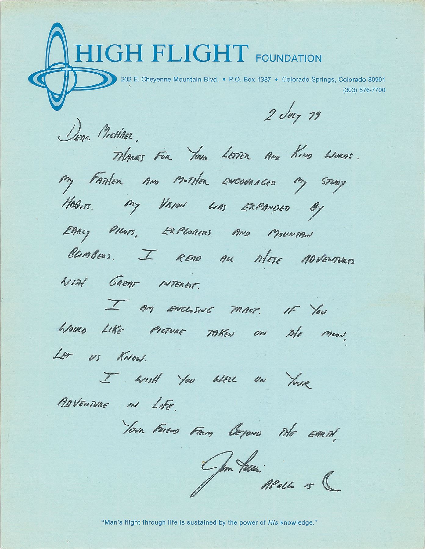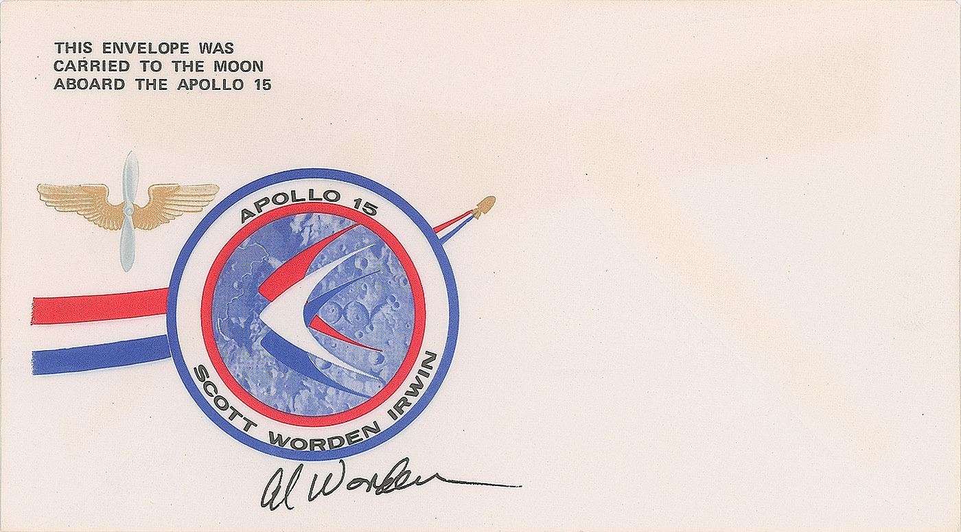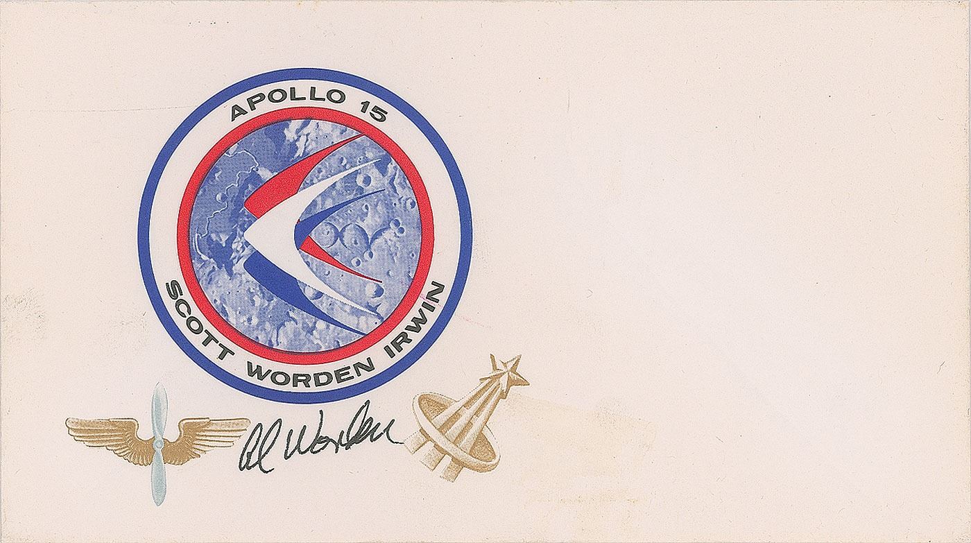 Two items: an ALS, signed "Jim Irwin, Apoll[o] 15," one page, 8.5 x 11, High Flight Foundation letterhead, July 2, 1979, in part: “My father and mother encouraged my study habits. My vision was expanded by early pilots, explorers and mountain climbers. I read all these adventures with great interest"; and a pair of 'Bishop' and 'Sieger' commemorative covers with color cachets of the Apollo 15 mission insignia, both signed in black ink by Al Worden, with the unnumbered 'Sieger' captioned in the upper left corner, "This envelope was carried to the moon aboard Apollo 15." In overall fine condition.