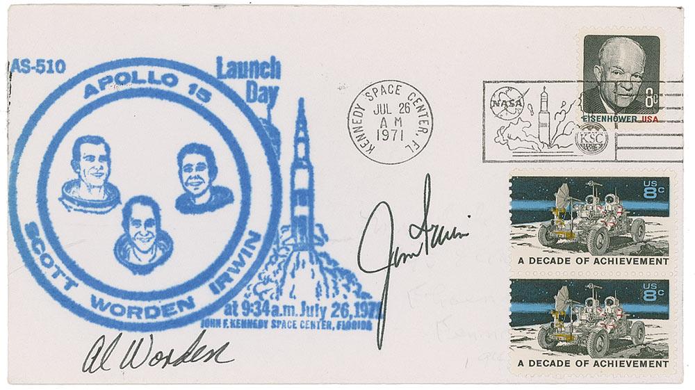 Apollo 15 Launch Day postal cover with a cachet honoring the Apollo 15 crew, signed in black felt tip by Jim Irwin and Al Worden. In fine condition.