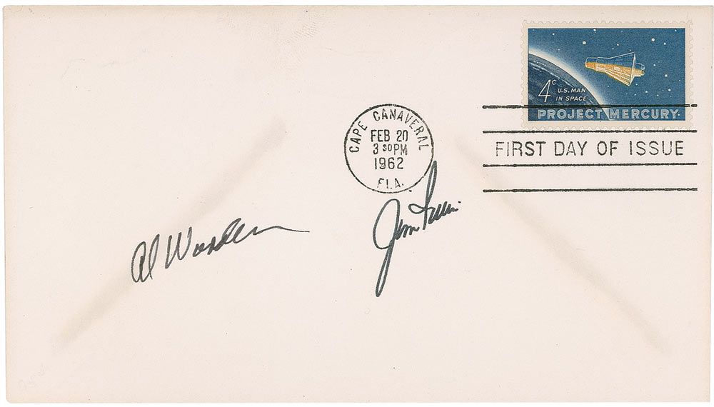 FDC with a Project Mercury postage stamp and a February 20, 1962, Cape Canaveral postal cancellation, signed in black felt tip by Al Worden and Jim Irwin. In fine condition, with two light diagonal lines of toning, one passing through a small portion of Worden’s signature.