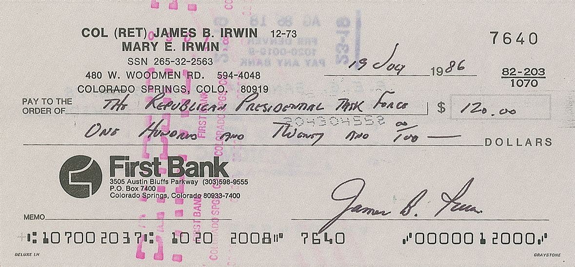 Two checks: a personal check, 6 x 2.75, filled out and signed by Conrad, "Charles Conrad, Jr.," payable to Southern California Edison for $6.14, January 15, 1977; and a personal check, 6 x 2.75, filled out and signed by Irwin, "James B. Irwin," payable to the Republican Presidential Task Force for $120, July 19, 1986. In overall fine condition.