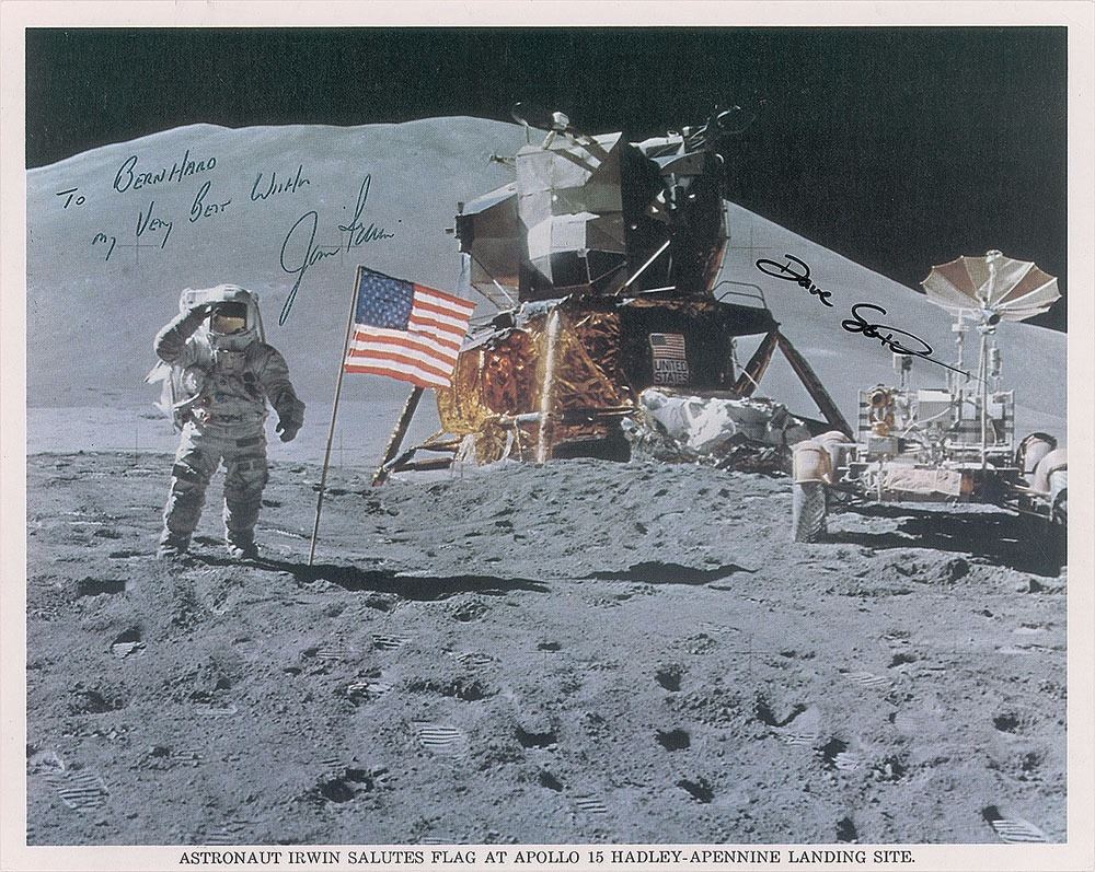 Official color 10 x 8 NASA lithograph of Irwin saluting the American flag on the lunar surface during an Apollo 15 EVA, signed and inscribed in black felt tip, "To Bernhard, My Very Best Wishes, Jim Irwin" and "Dave Scott.” In fine condition.