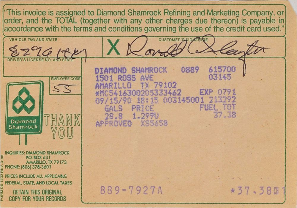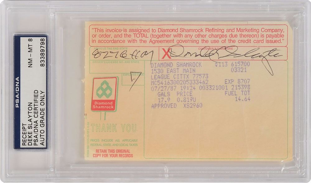 Group of three credit card receipts, including: an American Express receipt for the purchase of "Aspen Wood" and "Schrock Casserole" in the amount of $83.07, signed "James B. Irwin"; a 1990 Diamond Shamrock receipt for $37.38, signed "Donald K. Slayton"; and a 1987 Diamond Shamrock receipt for $14.64, signed "Donald K. Slayton," encapsulated in a plastic PSA/DNA authentication and grading holder, evaluating the autograph as "NM-MT 8." In overall fine condition.