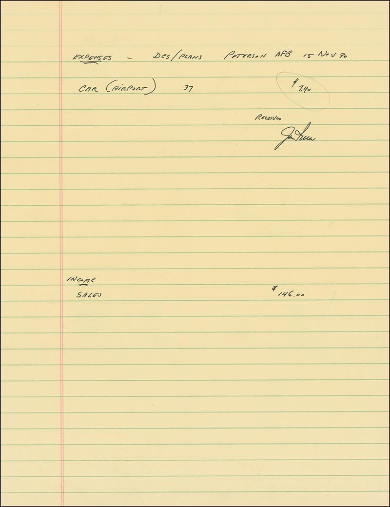 Two one-page handwritten expense reports on individual yellow 8.5 x 11 lightly-lined sheets, for trips to Fort Collins and Peterson Air Force Base, each signed by Irwin. In fine condition.