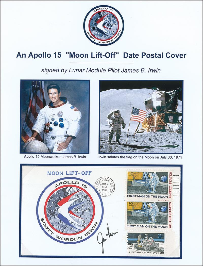Apollo 15 moon lift-off postal cover with a cachet of the mission’s emblem, and stamped “Moon Lift-Off,” signed on the front in black ink. Removably presented on a color 8.5 x 11 informational sheet. In very fine condition.