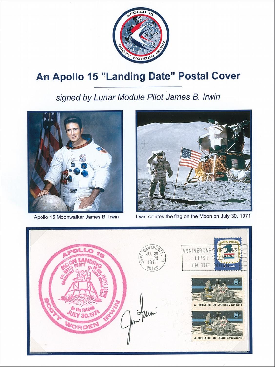 Apollo 15 landing date postal cover with a cachet honoring the Apollo 15 moon landing, signed on the front on black ink. Removably presented on a color 8.5 x 11 informational sheet. In very fine condition.