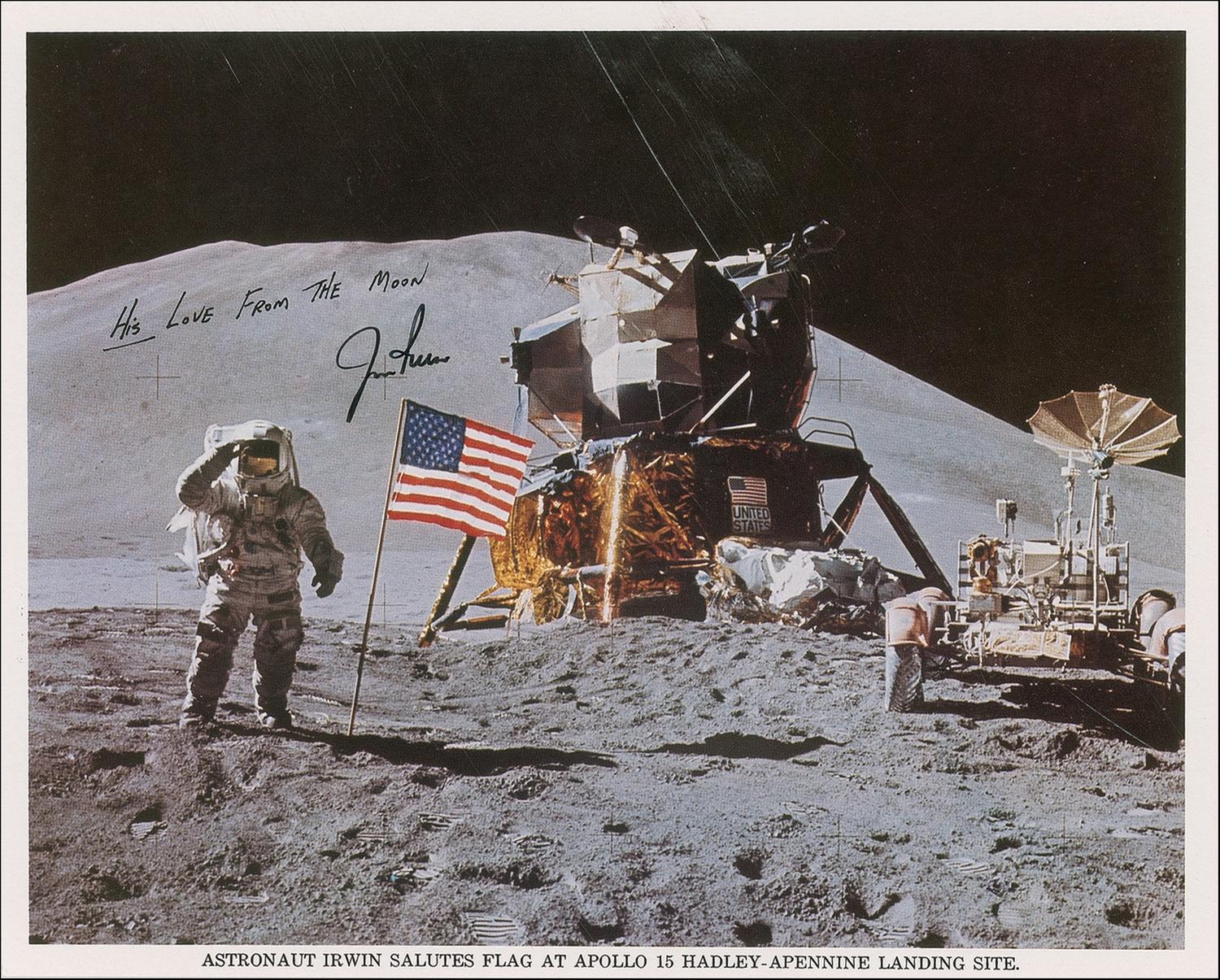Color 10 x 8 NASA photo of Irwin saluting the American flag on the lunar surface, signed in black felt tip under a pre-printed sentiment. In fine condition with several surface scratches.