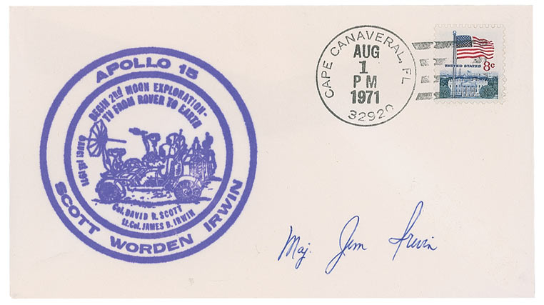 Commemorative cover with a cachet honoring the Apollo 15 mission, signed in blue ballpoint “Maj. Jim Irwin.” In fine condition.