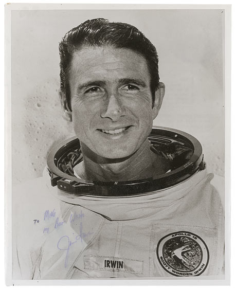 Glossy 8 x 10 NASA photo, signed and inscribed in blue ink “To Mike, My Best Wishes, Jim Irwin.” In very good condition, with creasing, rippling, and mild haloing and bleeding of the signature and inscription. Accompanied by a full letter of authenticity from Scott Cornish.