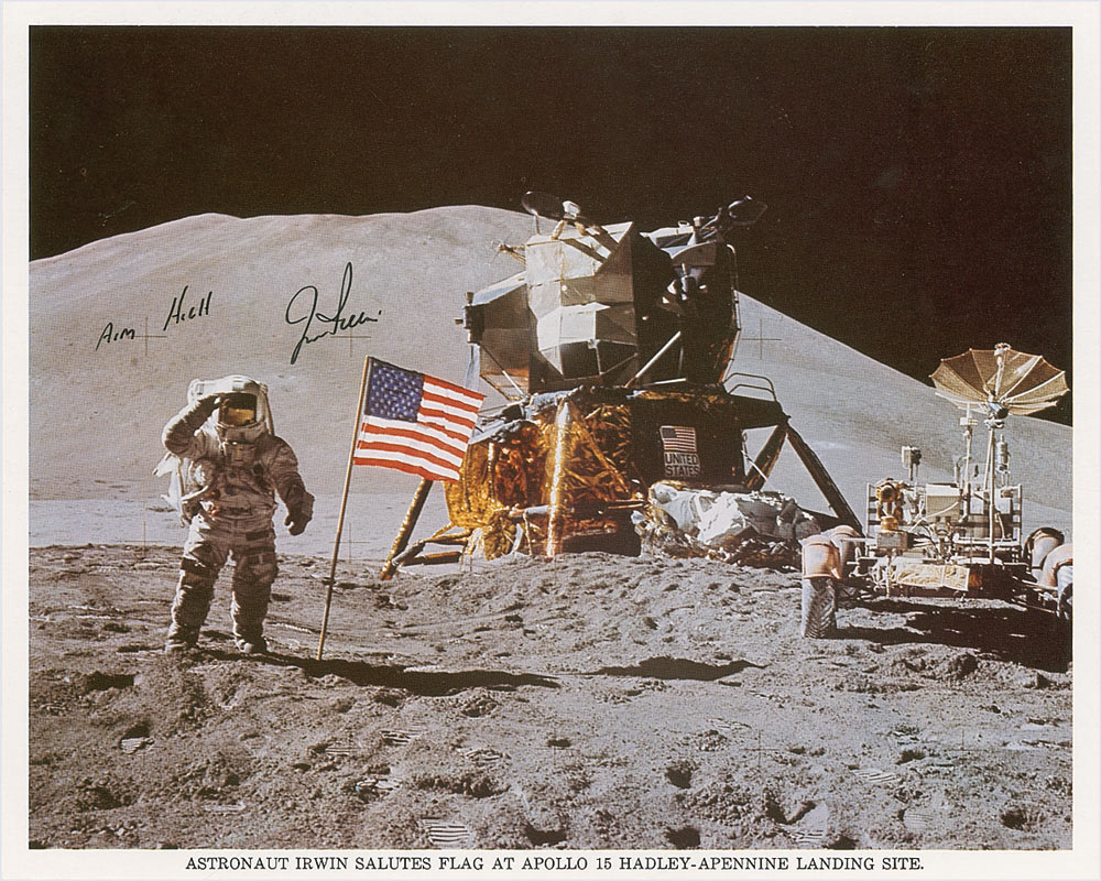 Color 10 x 8 NASA photo of Irwin saluting the flag on the lunar surface, signed in black felt tip, “Aim High, Jim Irwin.” In very fine condition.